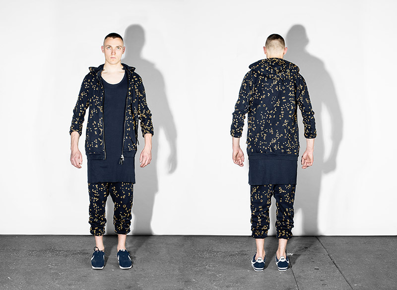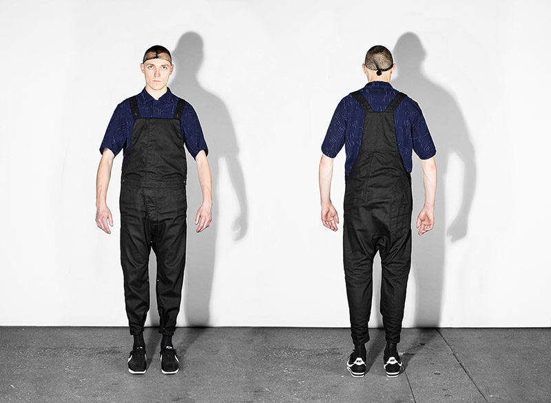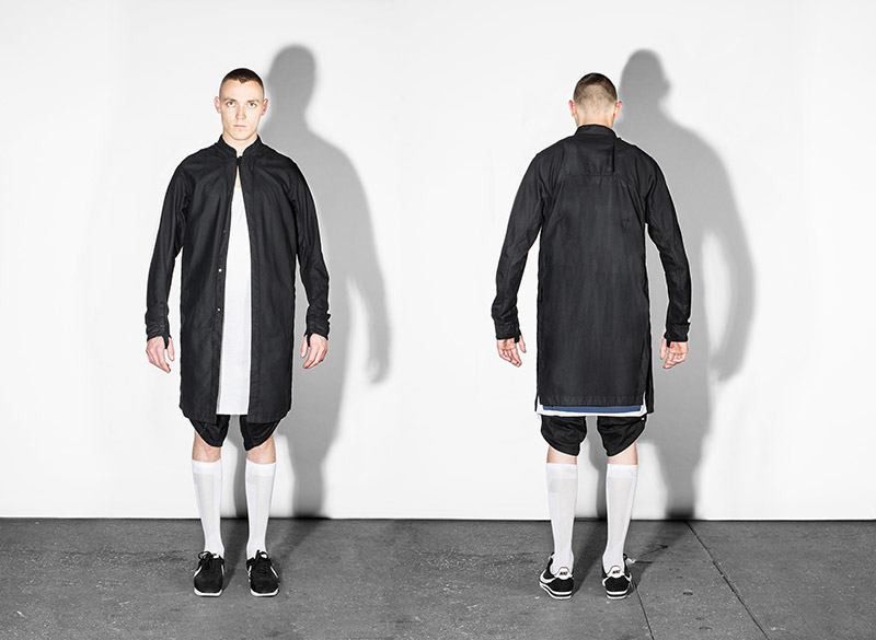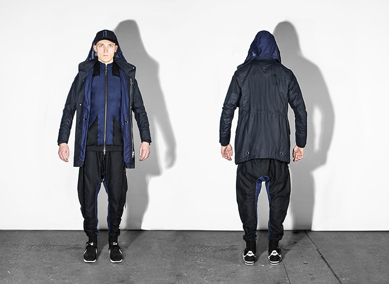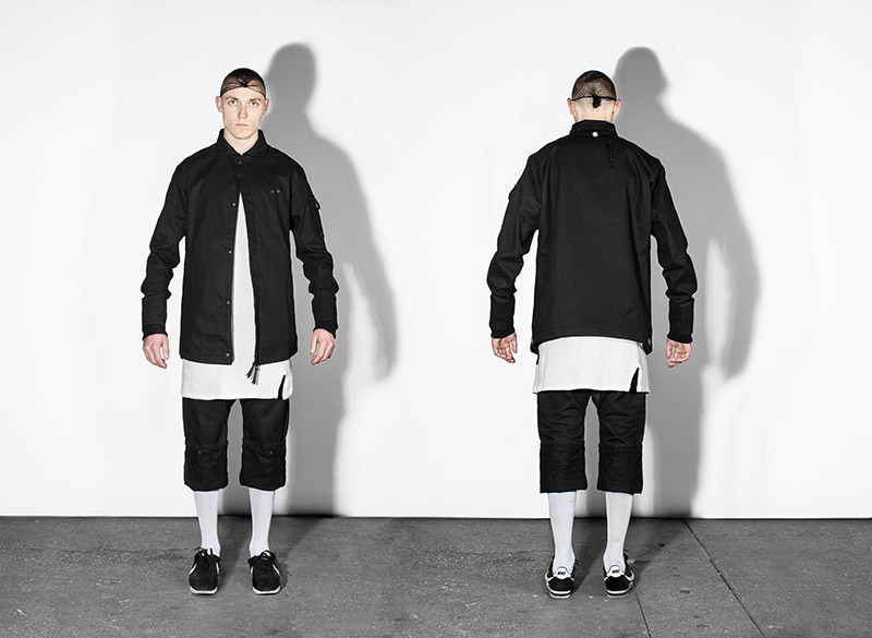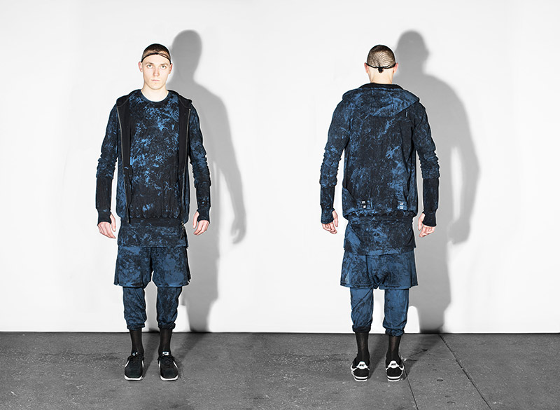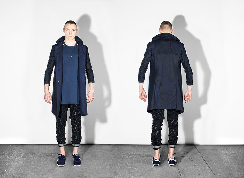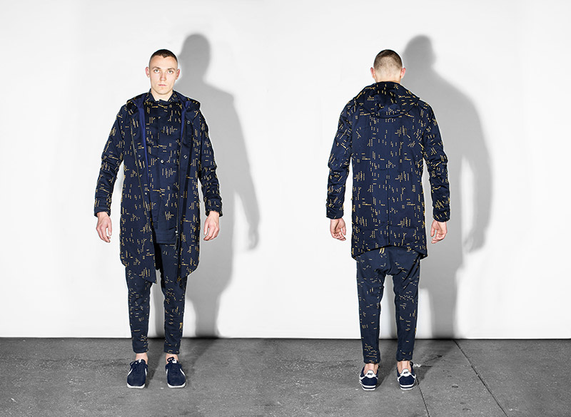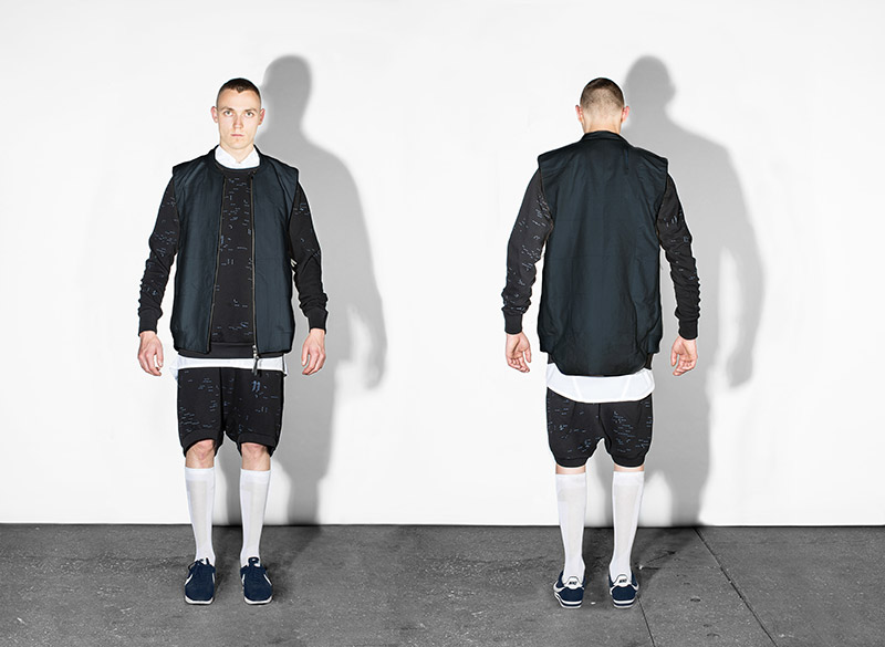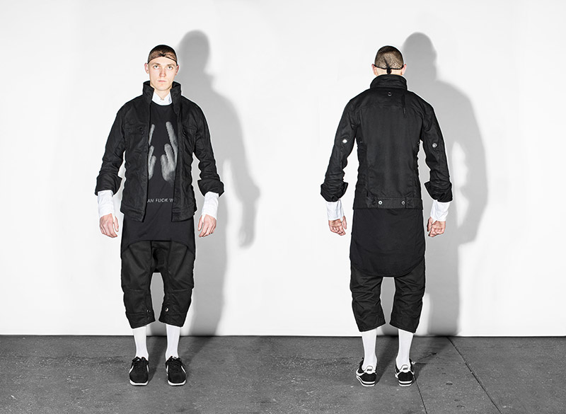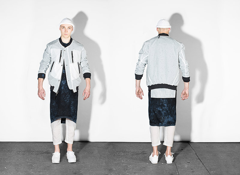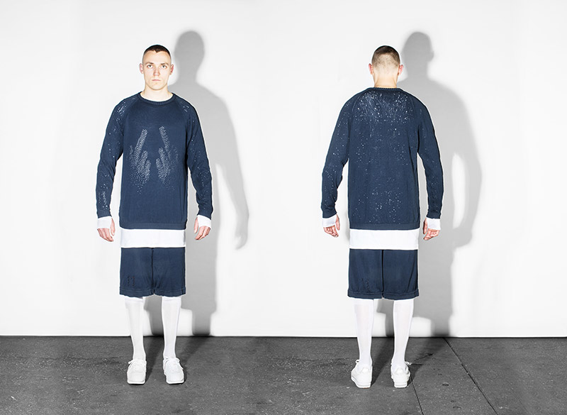 Black, white and navy – understanding navy as a tone of black – is the chromatic choice according to the inspirational subjects. Holes are a common thread throughout the collection as an analogy to bullet holes textures, declined in variant techniques as laser, knitting or embroidery. Keeping the holes concept, grommets are applied on garments as a reference to marine uniforms.