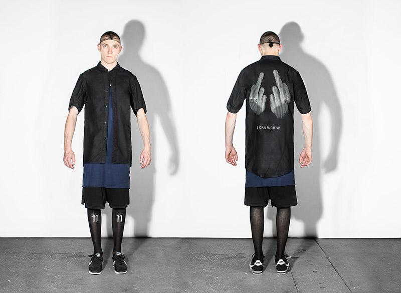 Gold embroideries are elaborated as a deconstructed adaptation of marine dress trimmings, providing graphical metrical textures. A two middle finger artwork that stands as the 11 gang sign is printed and perforated as a classic positional graphic.