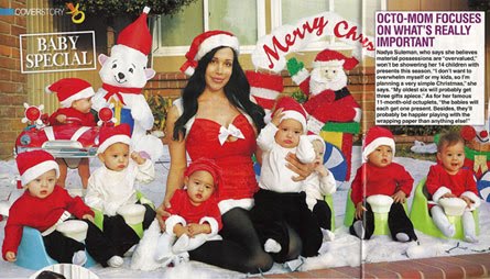 OctoMom is still one of the hardest working baby pimps. She slipped into a ho ho ho onesie and pushed half of her little helpers in front of the cameras for Life & Style…