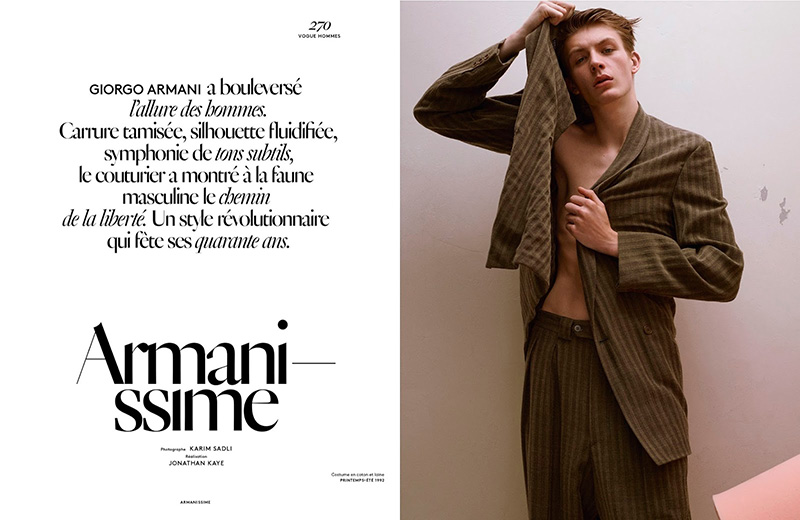 “Anton Toftgard, Finnlay Davis and Sol Goss photographed by Karim Sadli and styled by Jonathan Kaye with pieces from Giorgio Armani, for the latest issue of Vogue Hommes International…