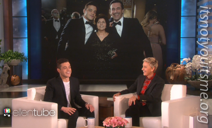 In two separate interviews comedian Kevin Hart and actor cutie Rami Malek spill the Golden Globes backstage drama on Ellen, which by the way was a great show. The boys are in Ellen’s yard below.