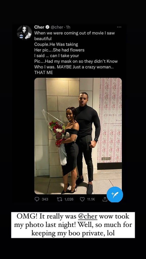 “OMG! It really was @Cher wow took my photo last night,” said the blogger, reposting Cher’s viral tweet to her Instagram Story. “Well, so much for keeping my boo private, lol,” she added.