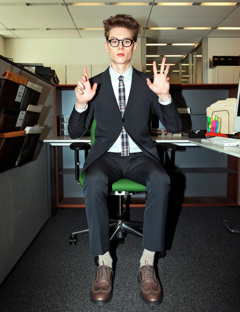 ‘Armed with a talented eye for crisp photography, Matthew Kristall and Ford model Aiden Andrews invade the New York Times headquarters for a workout in “50 Exercises To Do With Your Suit On”. Styled by Jason Rider, Aiden puts his best foot forward and delivers a hillarious performance.’ – thefashionisto.com