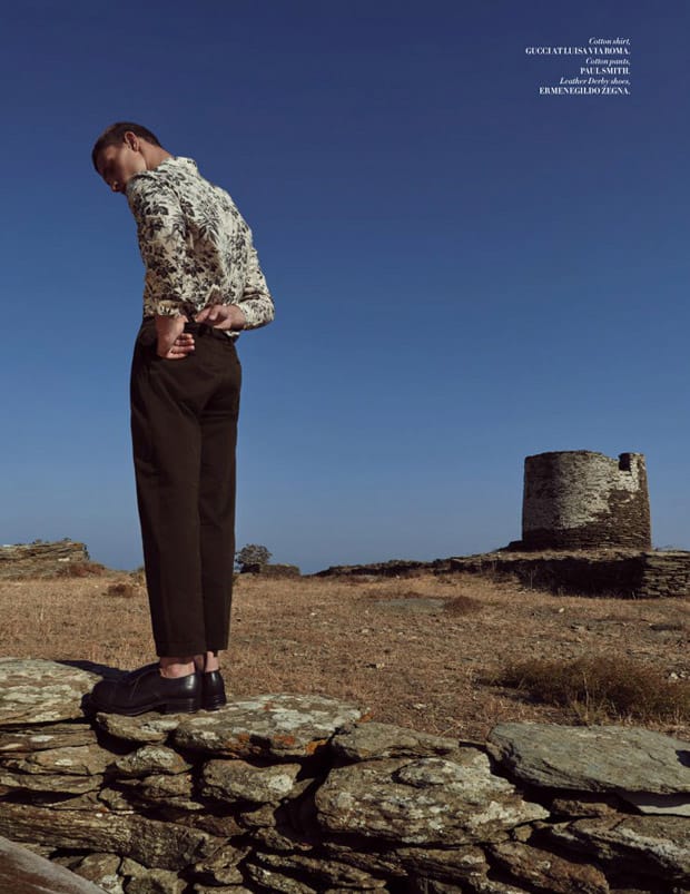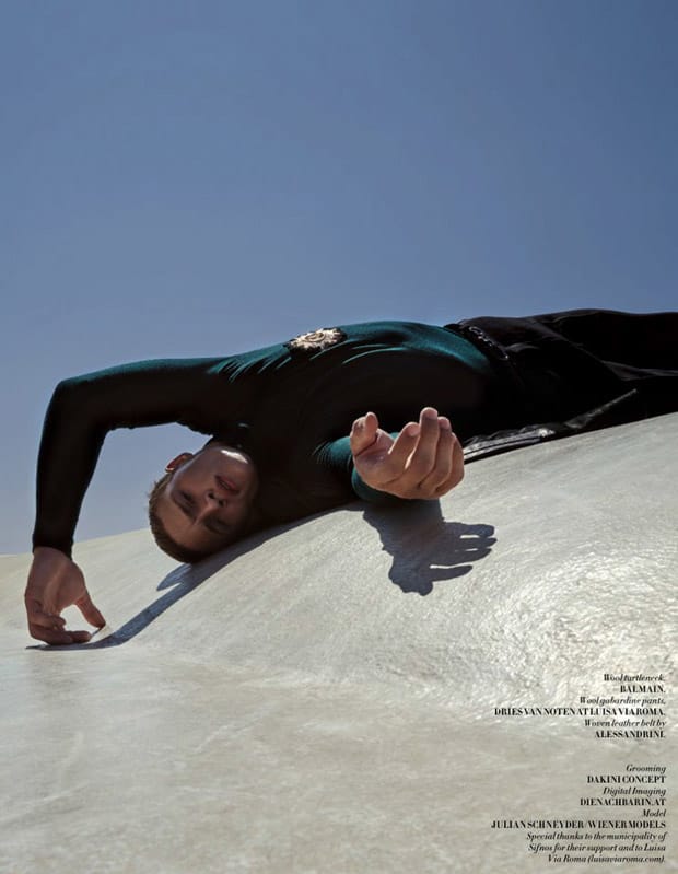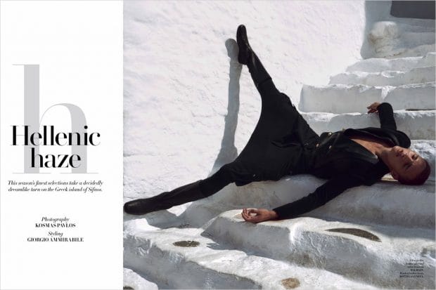 “Hellenic Haze story captured by fashion photographer Kosmas Pavlos for the October 2016 edition of L’Officiel Singapore stars Austrian top model Julian Schneyder. Styling is work of Giorgio Ammirabile. For the session Julian is wearing selected looks from top brands such as Bottega Veneta, Neil Barrett, Ermenegildo Zegna, Giorgio Armani, and Paul Smith to name a few.” – Malemodelscene.net