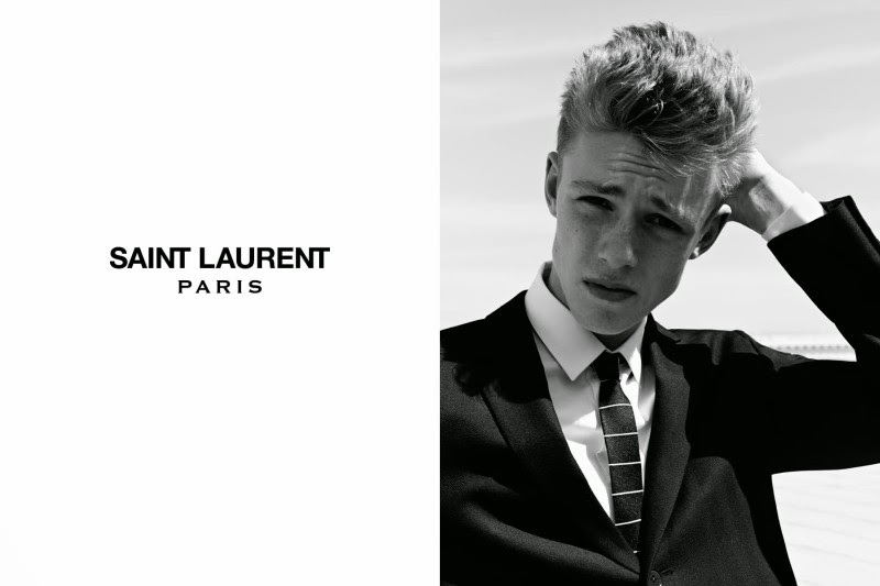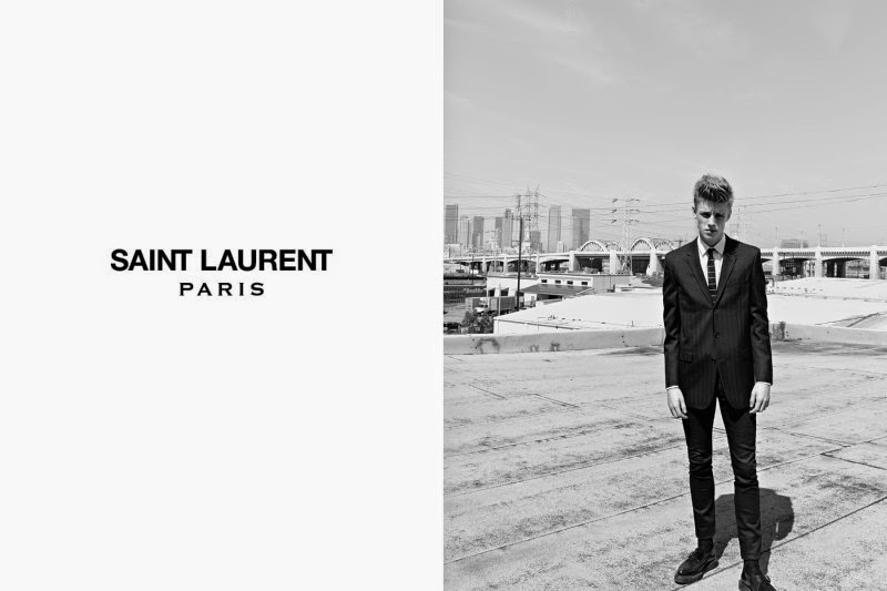 “Saint Laurent Fall/Winter 2014 Campaign–Once again, Saint Laurent creative director Hedi Slimane shoots the brand’s latest advertising campaign. For fall/winter 2014, Slimane connects with British musicians Jake Smallwood and Jack Dalby. Smallwood is the singer of White Room, while Dalby is a guitarist and the protege of music legend Paul Weller. The pair met with Slimane in Los Angeles, California this past May to pose for Saint Laurent’s campaign. A perfect fit for Slimane’s music scene-inspired design aesthetic, Smallwood and Dalby are picture perfect in black & white photos featuring Saint Laurent’s fall/winter 2014 collection.” – The Fashionisto