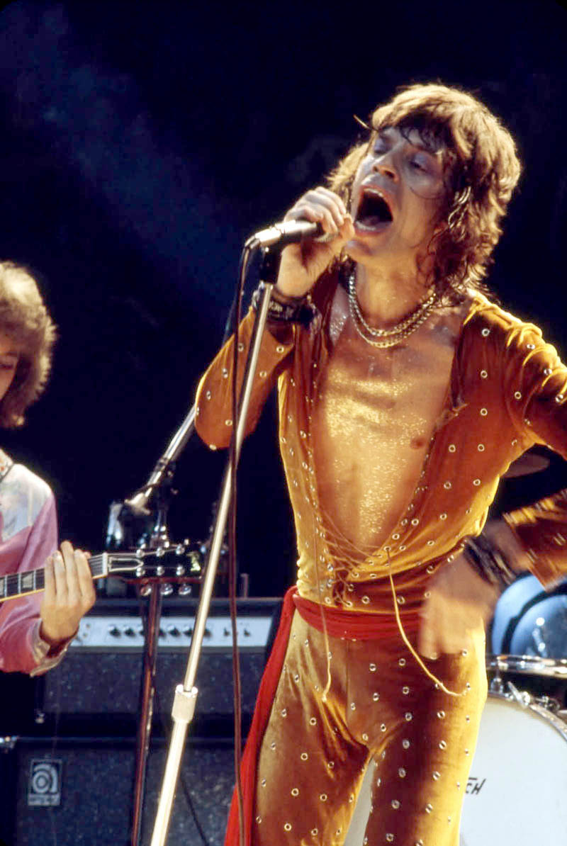 One of the greatest Mick moments is the Stones’ famous free concert in London’s Hyde Park in July 1969. It was supposed to be the big debut for their new guitarist Mick Taylor; tragically, Brian Jones, who they’d just fired, spoiled their plans by drowning in his pool. (Peak Brian: finding new ways to be a pain in the ass right to the end.) So they turned it into a Brian tribute, a hippie festival with security by the Hells Angels. (An idea that worked exactly once.) Mick begins by reading a poem to the crowd — Shelley’s “Adonais,” his elegy for John Keats. He stands with his book in a frilly white-lace shirt. It could have been a ridiculous moment, yet he commits beautifully. It’s the last moment in his career — maybe his life — where he’s caught in public taking anyone else’s utopian ideals seriously. Then the show begins and you can see Mick shake himself free of the whole Sixties myth. (Another crazy detail about this performance: King Crimson opened, so in the film footage, you can spot Robert Fripp at the side of the stage gazing on Mick like a stern chaperone.)