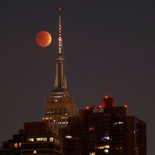 As sunlight filters through Earth’s atmosphere, the moon takes on its signature red hue. Totality begins at 6.04am ET, when the moon is fully immersed in Earth’s shadow.