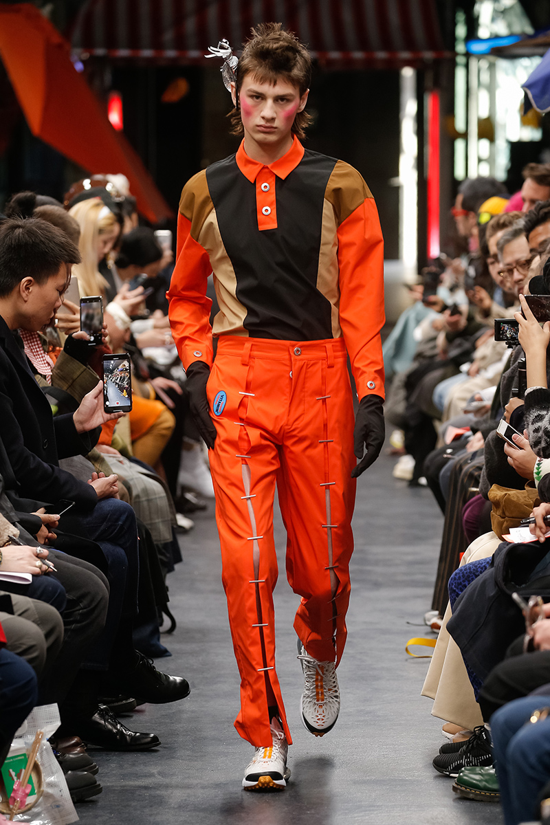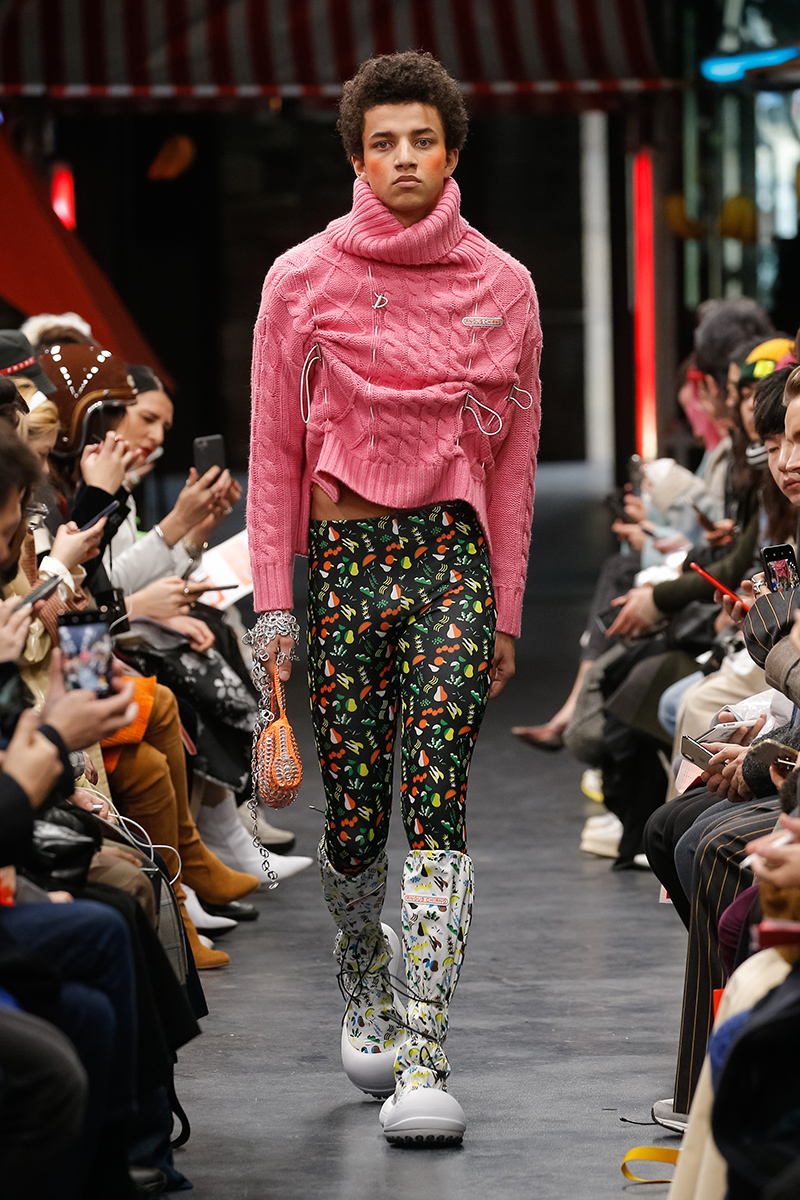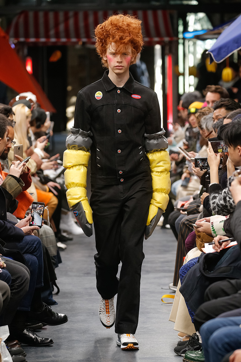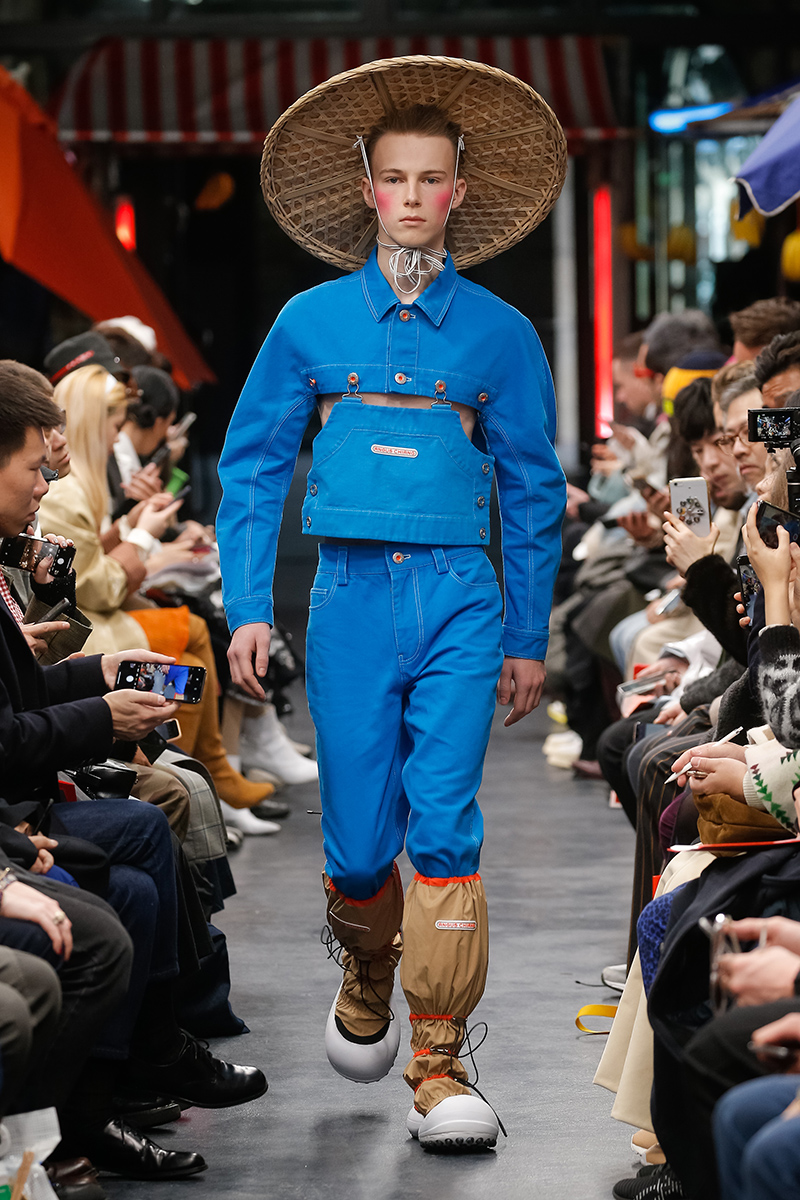 “Angus Chiang transported us to a Taiwanese market for FW19, fresh fruit and vegetables were stacked amongst kitsch stalls in ode to the primary industry of Chiang’s native Taiwan. Since the brand’s conception in 2015, Chiang has continued to craft a narrative of Taiwanese cultural heritage, this season he has collaborated with artist Hsian Jung Chen. The collection was illuminated with hand-dyed colorful puffer jackets and tassel-adorned separates in primary colors, paired with wicker bonnets and soda can necklaces. We caught up with the designer to discuss the new collection and how FW19 helped sculpt the identity of the brand.