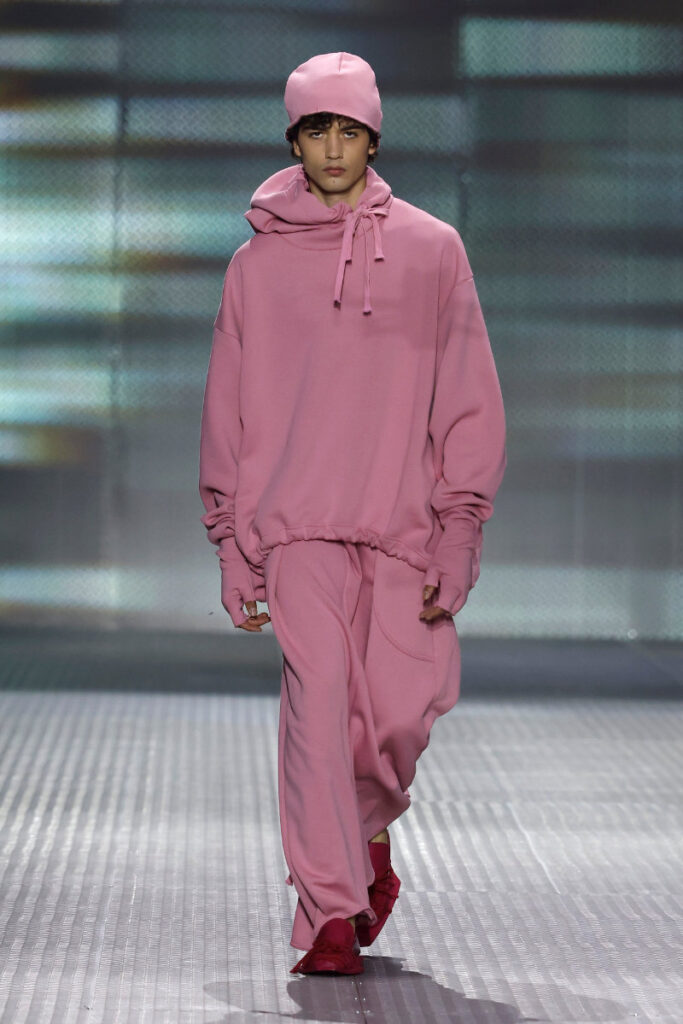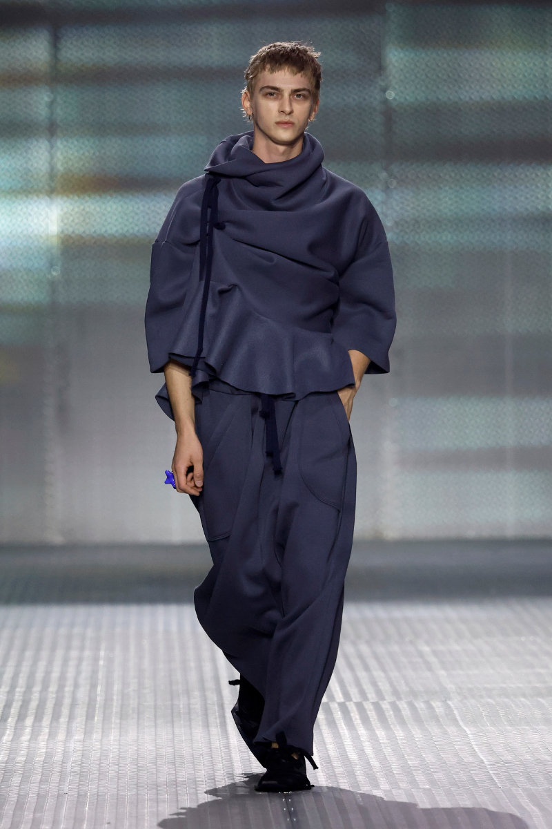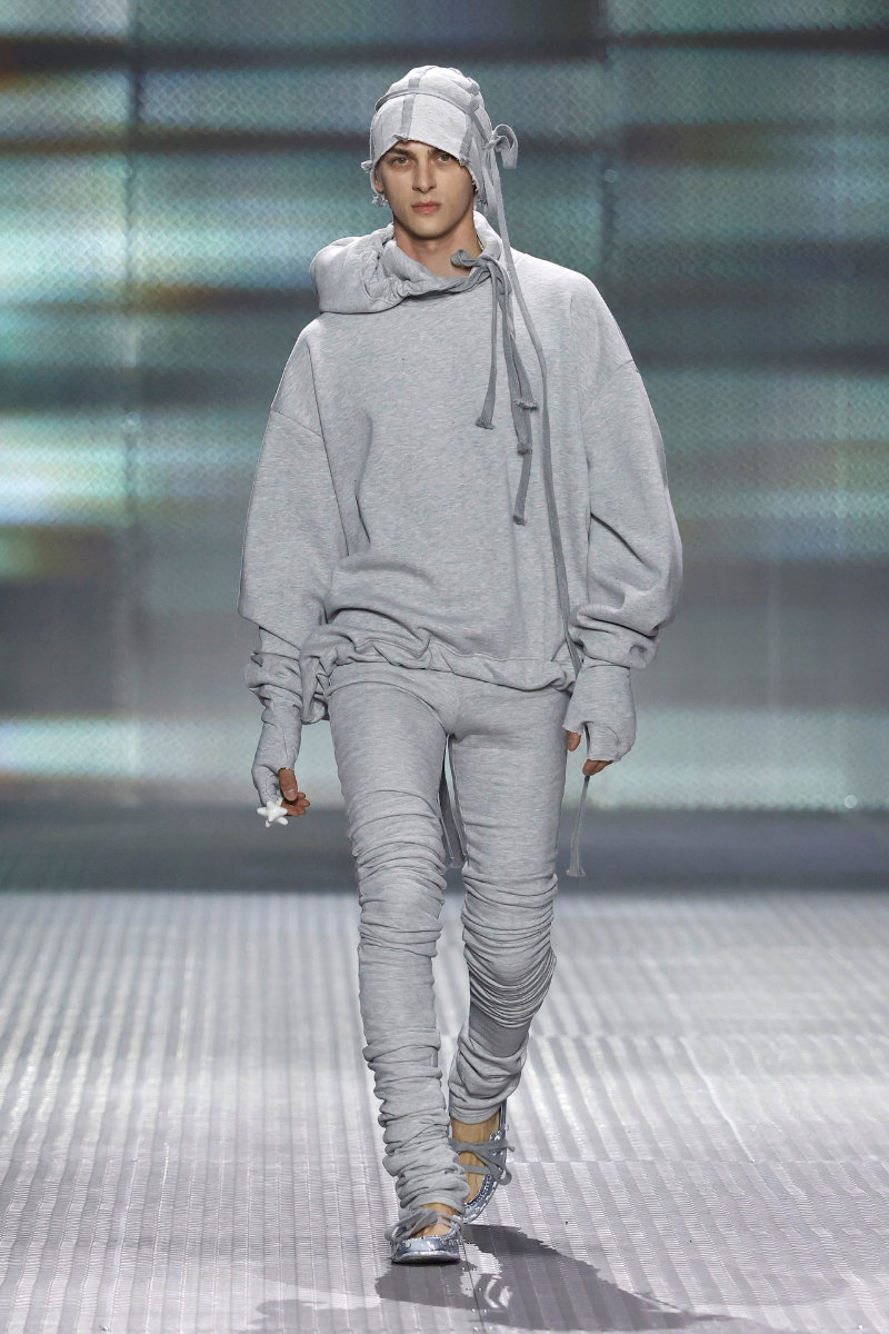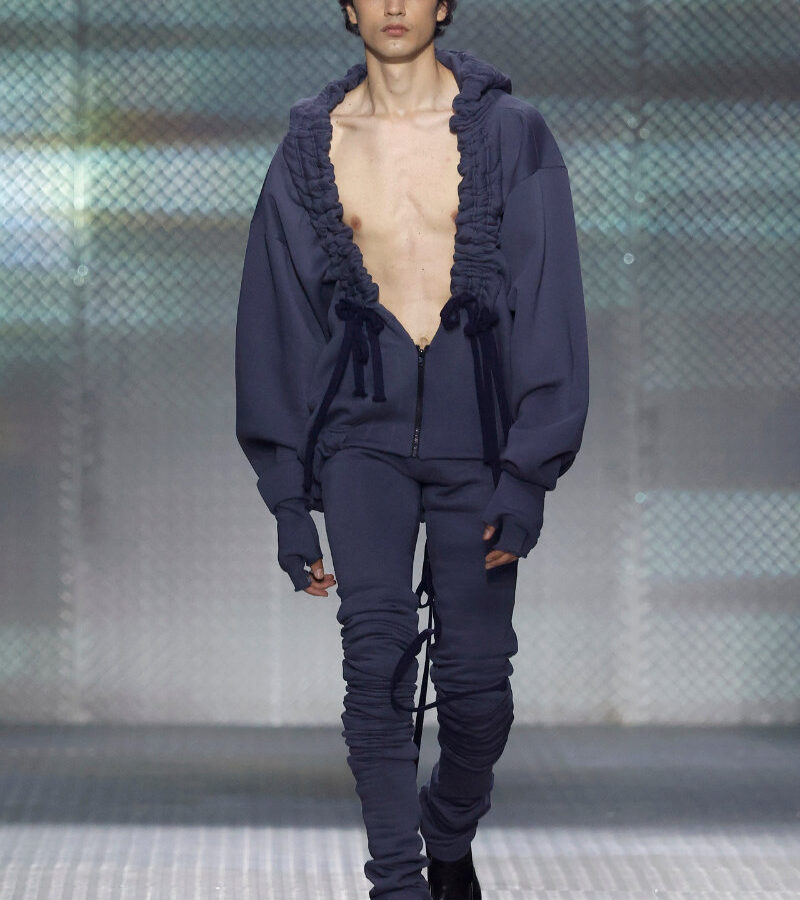 Look from AAA STUDIO’s “Señora, Suélteme El Brazo” runway collection.. Male model on a runway wearing a navy blue oversized hoodie with ruffled trim, unzipped at the chest, and matching joggers with drawstrings. Look from AAA STUDIO’s “Señora, Suélteme El Brazo” runway collection.. Male model on a runway wearing a navy blue oversized hoodie with ruffled trim, unzipped at the chest, and matching joggers with drawstrings.