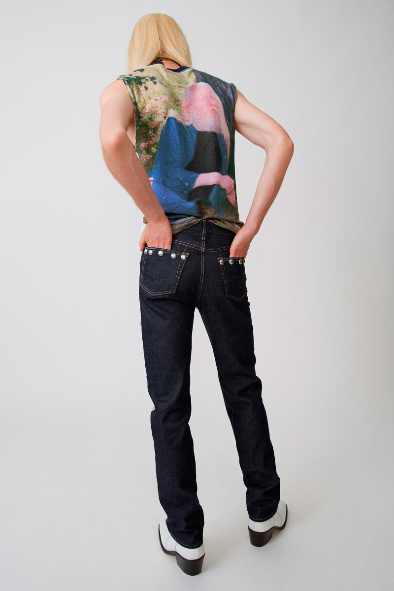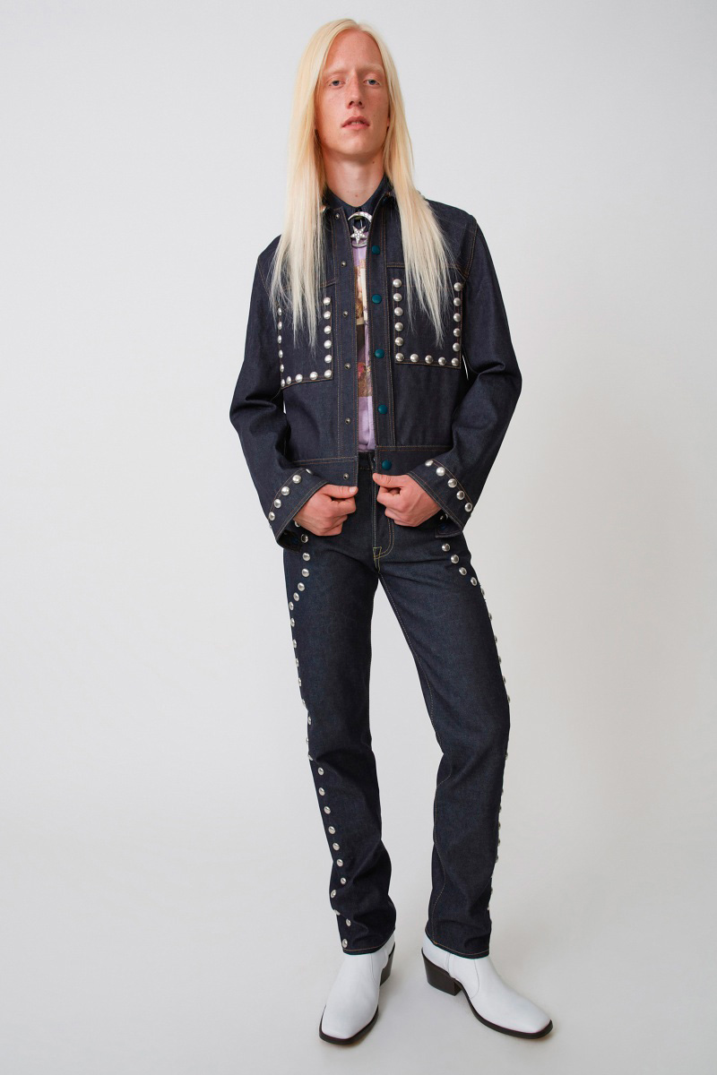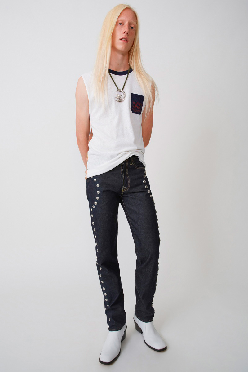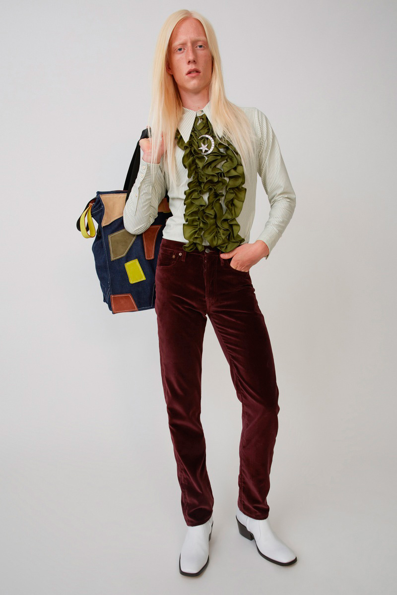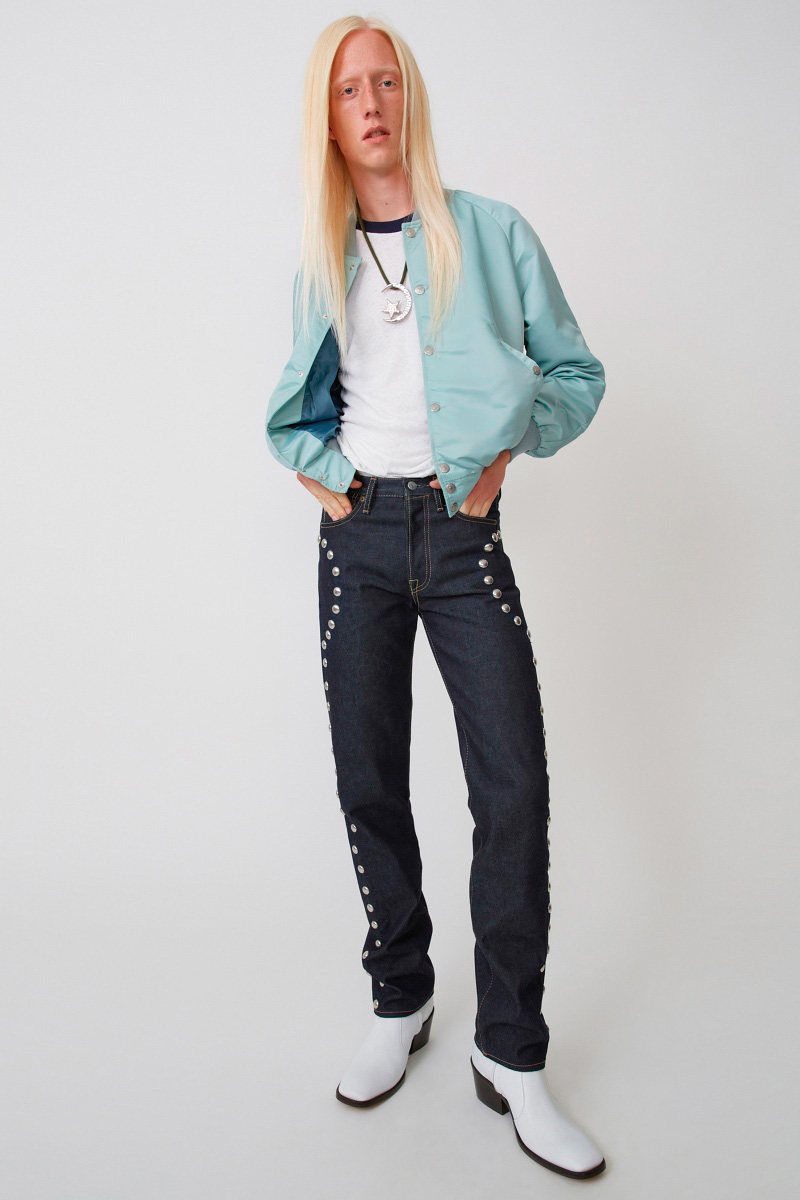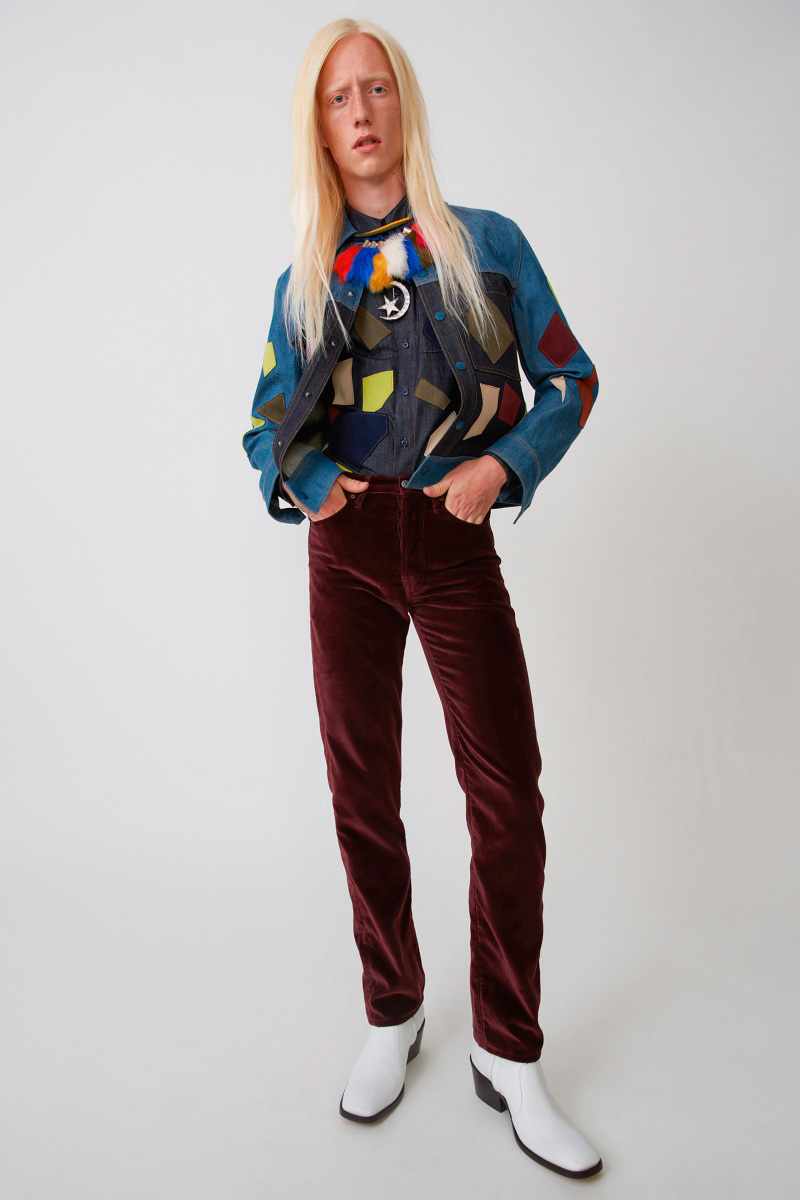 Delving into Johnny Winter’s personal archive, Acne Studios re-interpreted key pieces in an homage to the musician’s idiosyncratic visual persona both on and off-stage. A pair of dark rinse, straight leg jeans features stud details along the outer seams, while another pair of five pocket jeans is made from a deep burgundy velvet. There are three outerwear pieces: a duck egg blue varsity jacket, a mid-blue denim jacket with dark rinse panels and contrast color patches, and a dark rinse denim jacket with stud details along the collar, cuffs and patch pockets. A green and white striped tailored shirt with a pointed collar flashes rows of ruffles at the front, and a lilac t-shirt is emblazoned with Johnny Winter’s name.