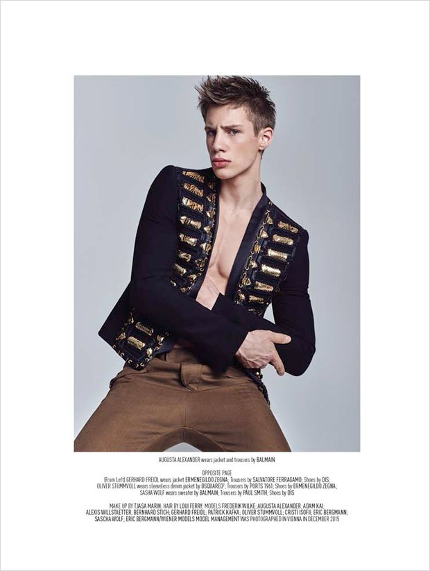 “Fashion photographer Kosmas Pavlos and stylist Giorgio Ammirabile at LOSTINTRANSLATIONS Milan team up for Active Duty story coming from the pages of August Man‘s latest edition. Stars of the session are Wiener Models‘ Frederik Wilke, Augusta Alexander, Adam Kai, Alexis Willstatter, Bernhard Stich, Gerhard Freidl, Patrick Kafka, Oliver Stummvoll, Eric Bergmann, Sascha Wolf, and Cristi Isofii. Hair styling is work of Loui Ferry, with makeup by Tjasa Marin.” – Malemodelscene.net