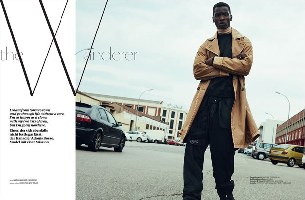 “Top model Adonis Bosso teams up with fashion photographer Nacho Alegre for The Wanderer story coming from the pages of L’Officiel Hommes Germany‘s latest edition. In charge of styling was Christian Stemmler with grooming by Michael Jones at Kasteel Agent.” – Malemodelscene.net
