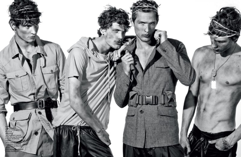 “Adrien Brunier, Louis Prades, Alexandre Gaillot and Laurent Albucher get dirty for the third issue of Guapo. Photographed by Yannick Leconte and styled by Philippe Uter, the group are given a chic militaristic makeover with garments from Kenzo, Yves Saint Laurent, John Galliano and others. Following a parade of stellar editorials, this and more is now available via the online edition offered through Other Edition.” -Fashionisto