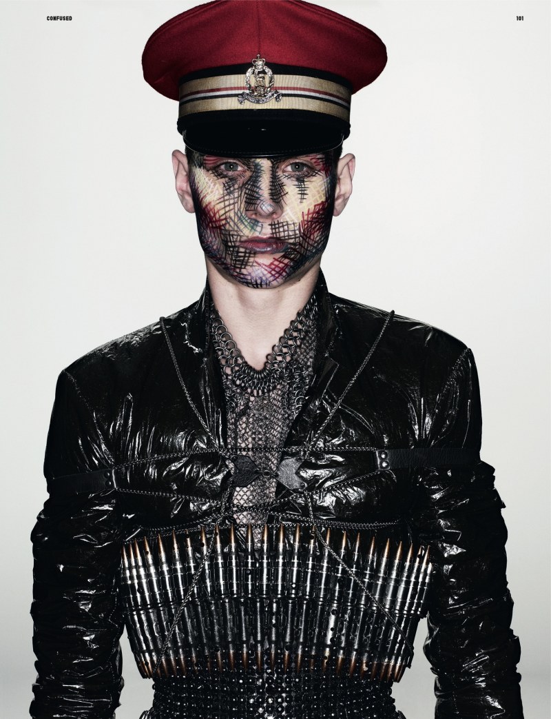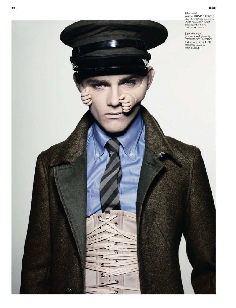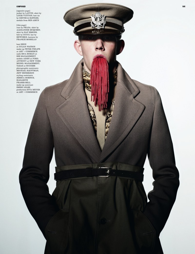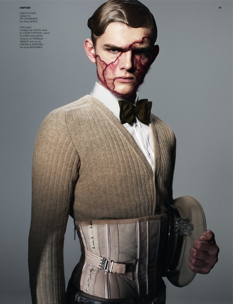‘Dazed & Confused fashion editor Robbie Spencer tackles the fall collections in a delightfully disturbing story photographed by Richard Burbridge. Manufactured as the season’s war heroes, Aiden Andrews, Anthony Murrell and Taras Koultun don the latest from an eclectic range of labels, canvassing everyone from Roberto Cavalli to J.W. Anderson.’ – Courtesy of thefashionisto.com