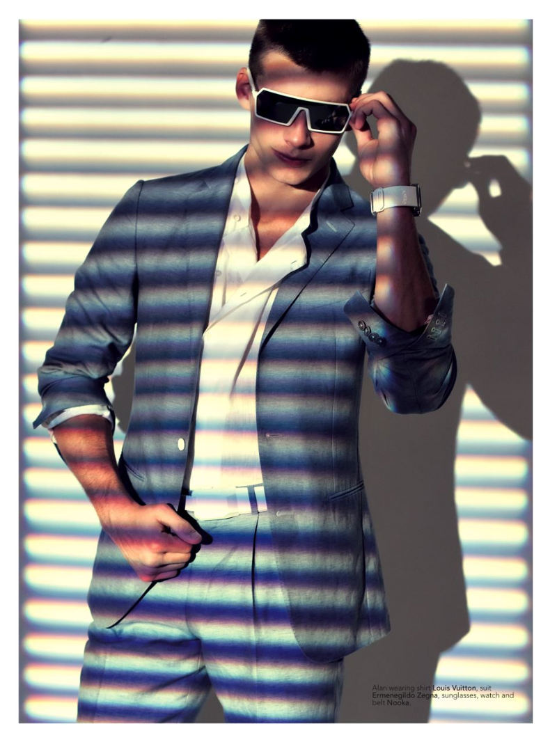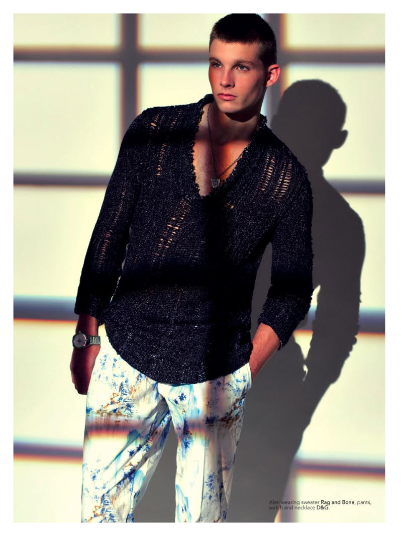 “Alan Carey (Red) appears in the latest edition of Kurv photographed by Richard Machado. Wearing spring looks, Alan is outfitted by stylist Eric Launder, who looks to a cool selection of pieces from Rag & Bone, Prada and other labels for an easy transition into spring.” -Fashionisto