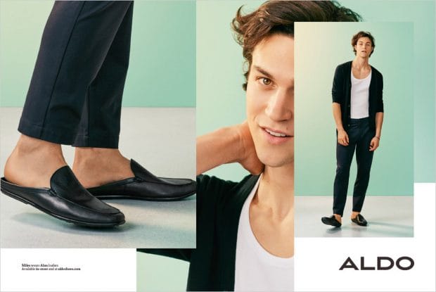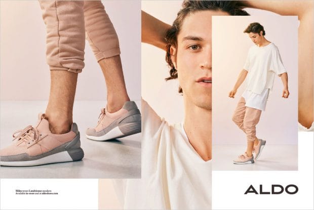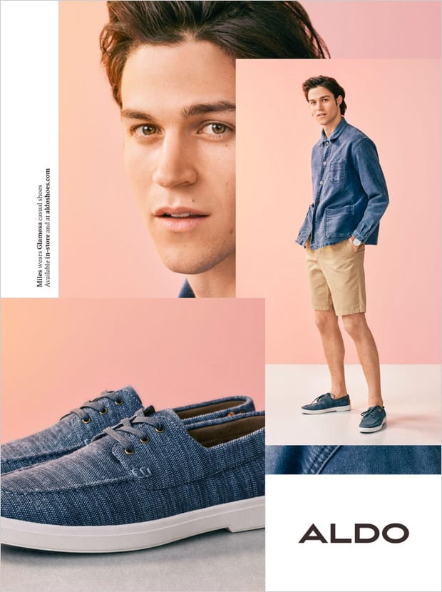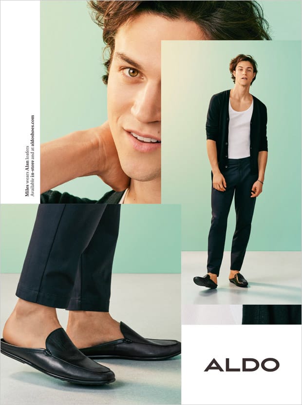 “Discover Aldo Shoes‘ Spring Summer 2017 menswear advertisement featuring top model Miles McMillan captured by fashion photographer Julia Noni. Styling is work of Emilie Kareh, with beauty from hair stylsit Rutger at Streeters, and makeup artist Karan Franjola. Set design is courtesy of Whitney Hellesen at Frankreps, casting direction by Piergiorgio Del Moro.” – Malemodelscene.net