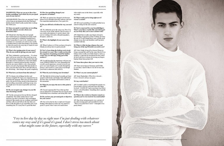 “Alessio Pozzi photographed by Brent Chua and styled by Eric McNeal, for the latest coverstory of Manifesto magazine.” – FY Magazine.es