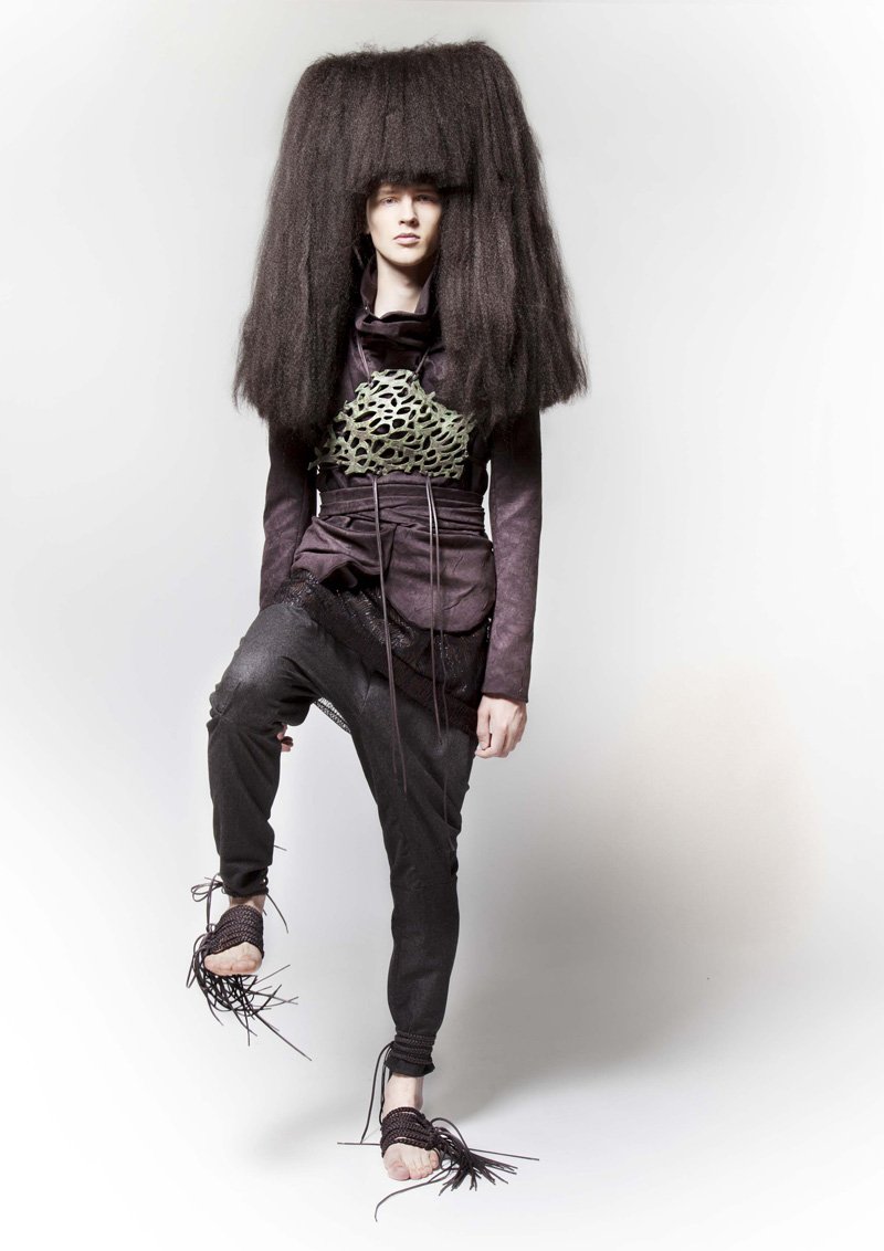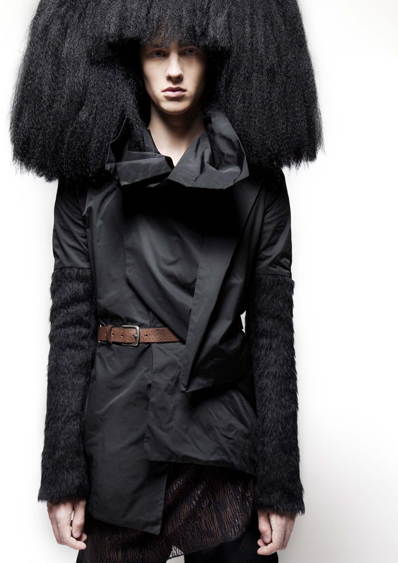 “Completing his education at Les Arts Décoratifs de Paris, designer Ronan Pecher pulls out all the stops for his year-end collection. Photographed by Rémi Lamandé, Major Paris models Alex Bennett, Oskar Landström, Danny Hoggins and Christian prance and pose in intricate monochrome ensembles. Entitled Lost in the Woods, the collection’s heart is felt in a rich color scheme that reinforces Pecher’s protagonist and his search for new-found strength and humanity. From soft knits and engaging fabrics to a skill in draping, Pecher’s collection delights the senses.” -Fashionisto
