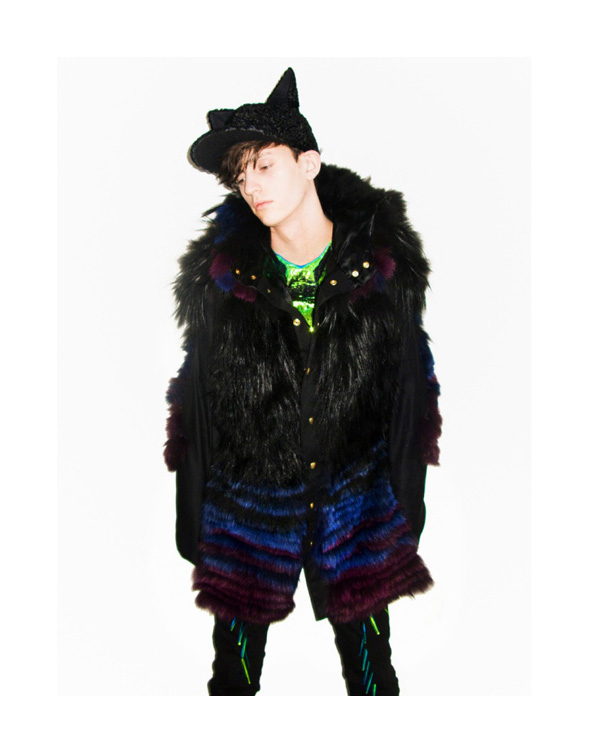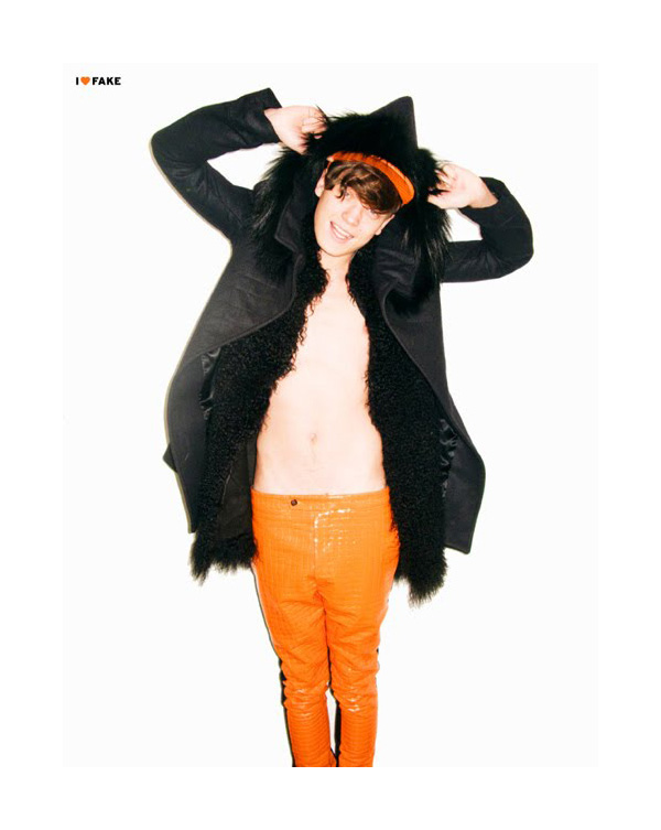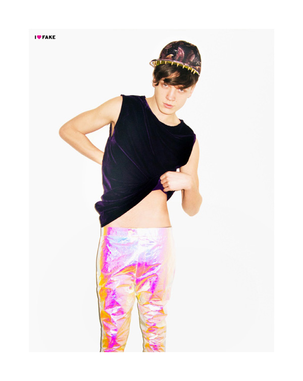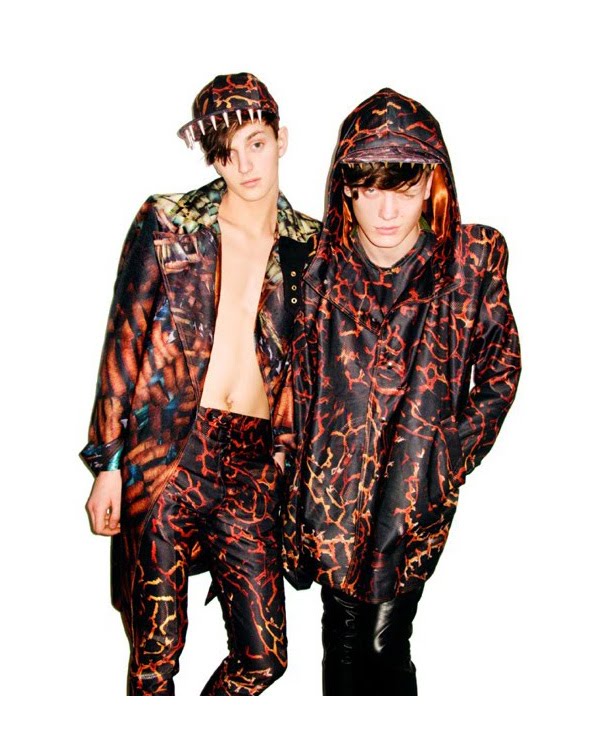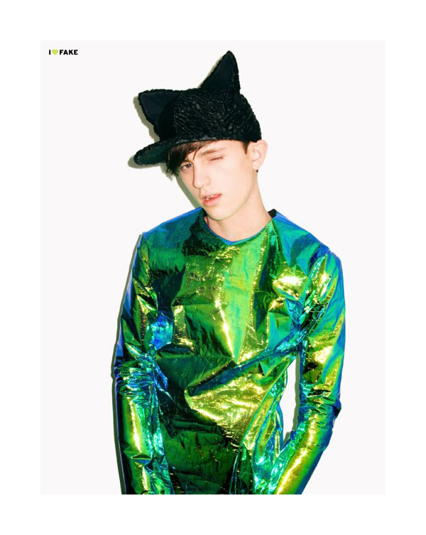 ‘Outfitted by Oliver Arlt in the fall collection of Katie Eary, Alex Dunstan and Alex Wells bring their mischievous antics to the latest issue of I Love Fake. Photographed in Jolijn Snijders’ signature high energy fashion, Alex² appear right at home in Eary’s quirky reptile-inspired designs.’ – Courtesy of thefashionisto.com