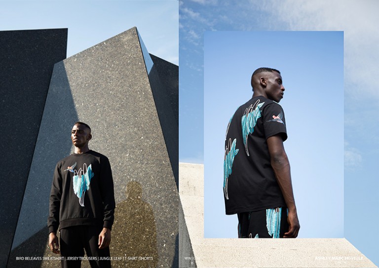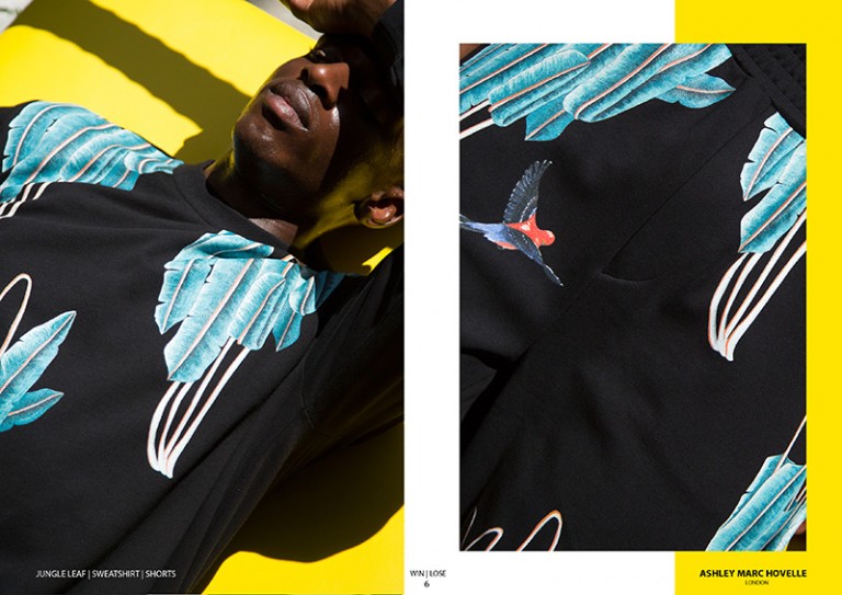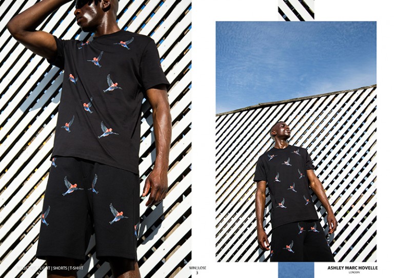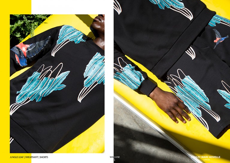 Ashley Marc Hovelle uses Hawaiian printed shirts and shorts inspired from Woody Harrelson’s character bringing vibrant blood orange, emerald blue and deep orchid colours to their signature collection. By using an advanced form of fine digital printing the brand is able to print vibrantly directly on to black garments. This unique process paved way for their collaboration with artist Anna Glover to create detailed hand painted tropical birds and jungle leaves on t-shirts, shorts and trousers.” – FY Magazine.es