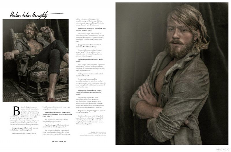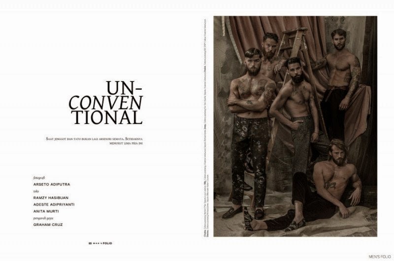 Unconventional-Photographed by Arseto Adiputra for the September 2014 cover story of Men’s Folio Indonesia, models André Hamann, Billy Huxley, Charlie Winzar, Declan-John Geraghty and Jimmy Launnay come together as the ‘unconventional’ stars. Wearing a vintage-inspired wardrobe, the models are styled by Graham Cruz as they exude a rustic charm. / Hair by Jody Taylor and Svajunas Grybe. Makeup by Joey Choy. Courtesy of – thefashionisto.com