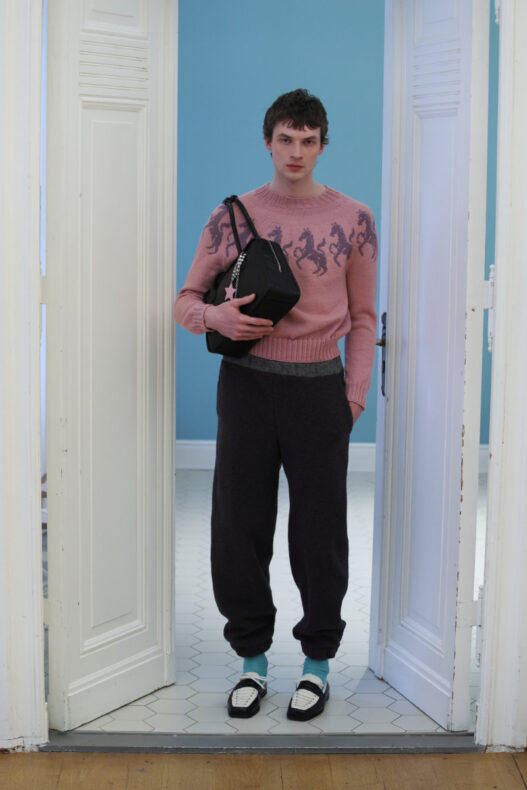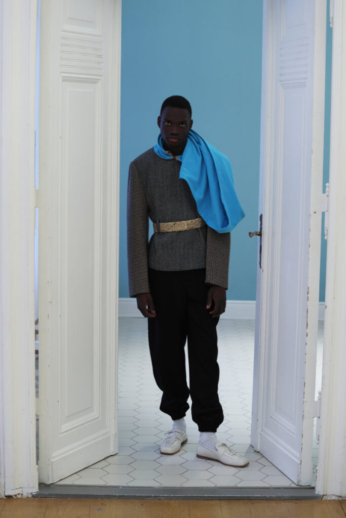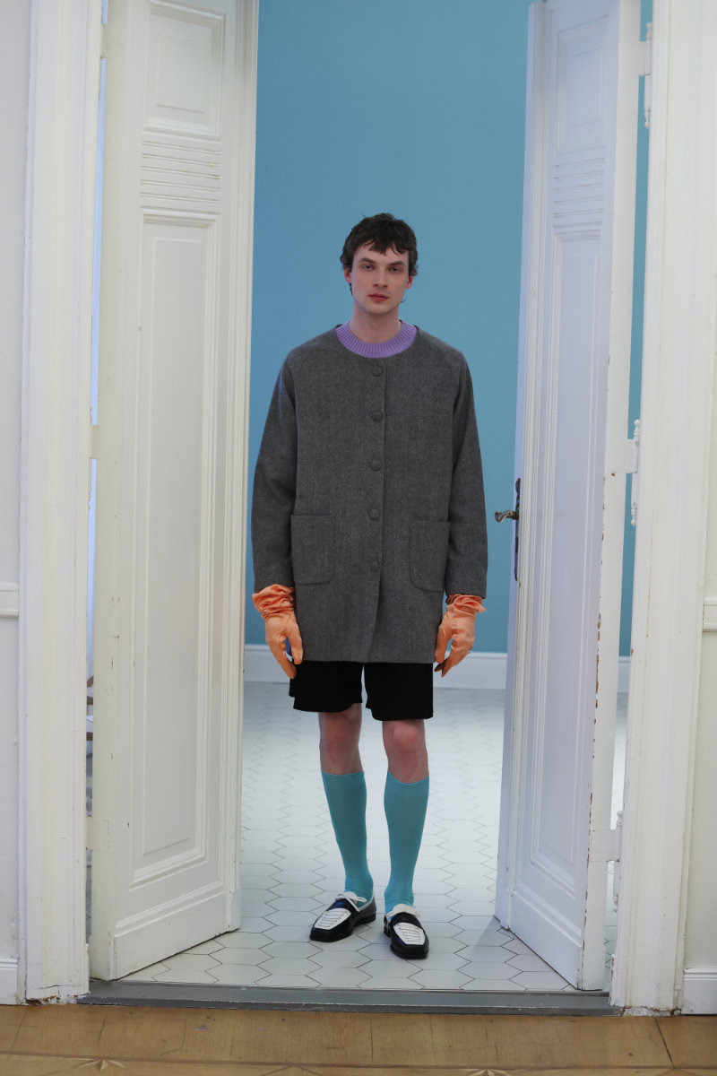 Andrej Gronau leans fully into playful distortion for his Fall/Winter 2026 collection, delivering a lineup defined by quirky cuts, off‑balance proportions, and silhouettes that twist menswear into something far more expressive. The lookbook — first revealed by DSCENE — captures the designer’s instinct for bending structure without losing refinement.
