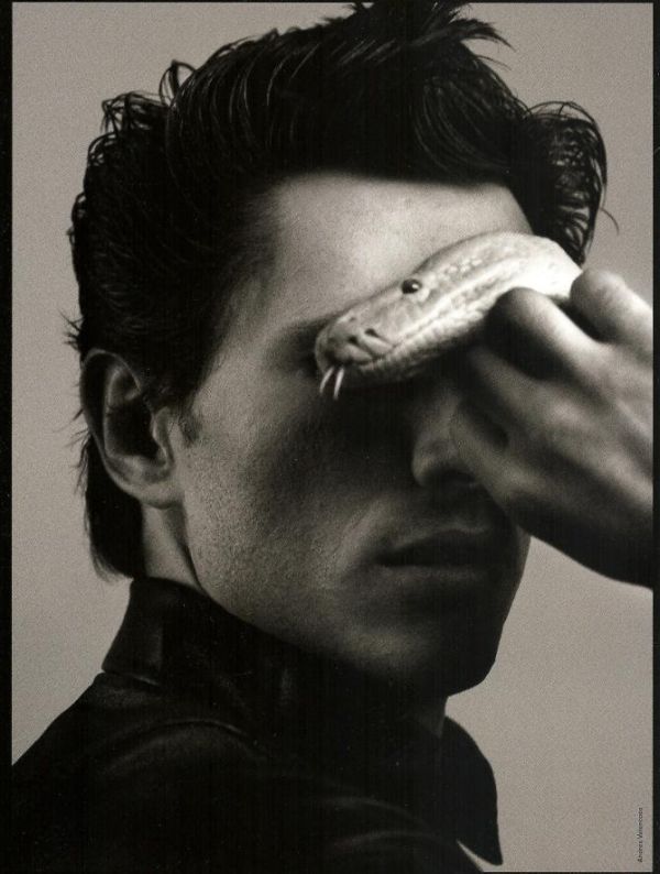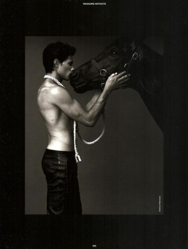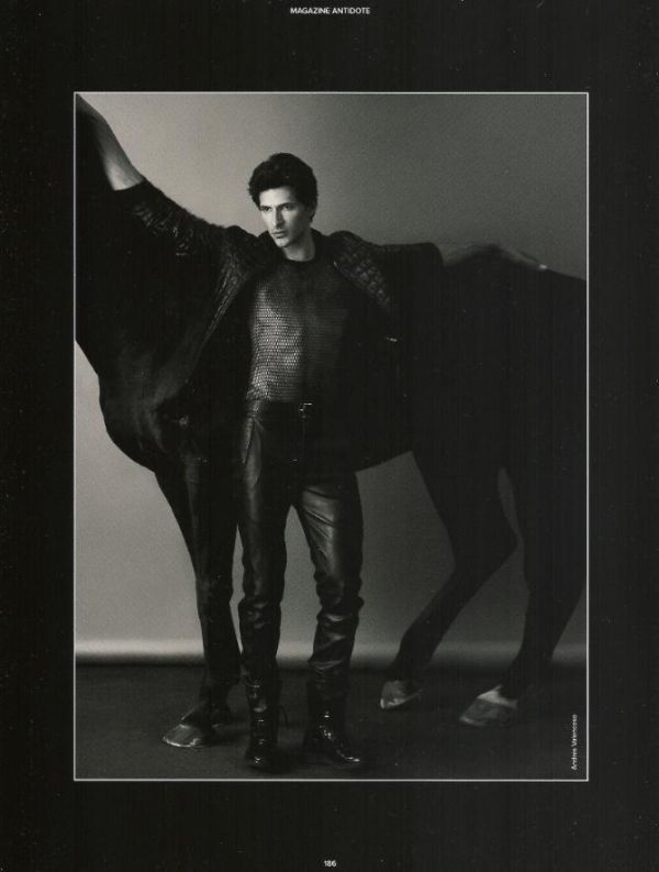 “Animalistic–Spanish model Andres Velencoso Segura gets unlikely co-stars for his latest editorial. Reuniting with photographer Txema Yeste, Andres is captured in black and leather looks with a horse and snake joining him for a very special Antidote spread.” – http://thefashionisto.com