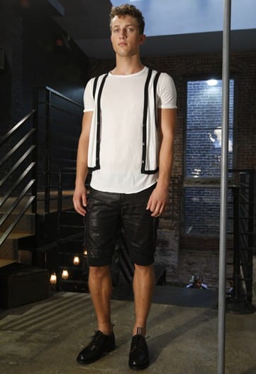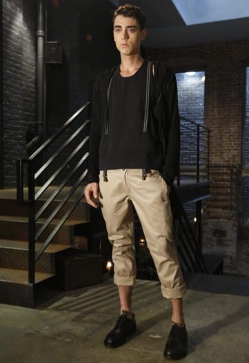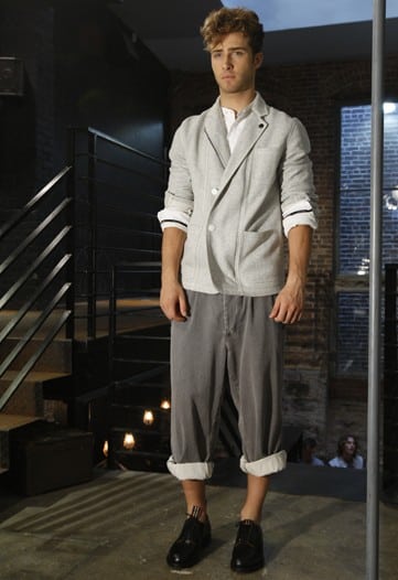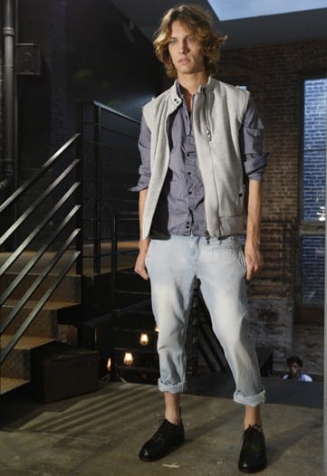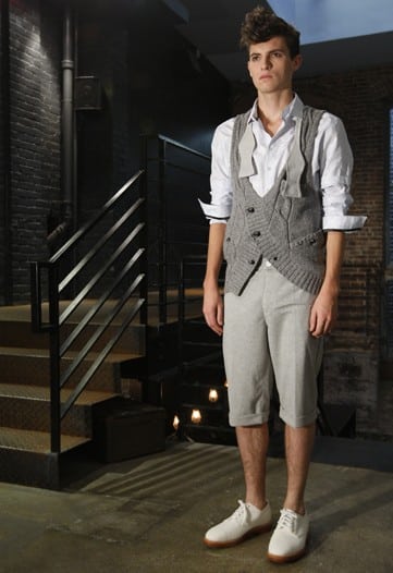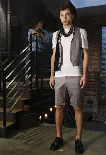 Buckler is a New York label which melds the Roguish American icon with a Brit edge. British designer Andrew Buckler disregards the universal monotony which plagues menswear, evading uniformity by superimposing detailed undertones with classic silouettes. For this season’s collection, innovative fabrics were utilized to stylish effect, such as cargo pants and double-breasted blazers made in Italy from chintzed linen -the fabric is sent through tight rollers to impart a subtle sheen- or dropped-crotch shorts fashioned from fleece. Some shirts were subtly decorated with a barely discernible camouflage pattern, and dandified jackets and blazers were adorned with thin chains inspired by Victorian watch fobs.