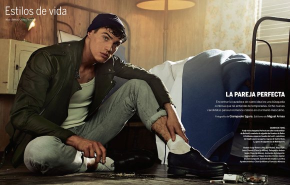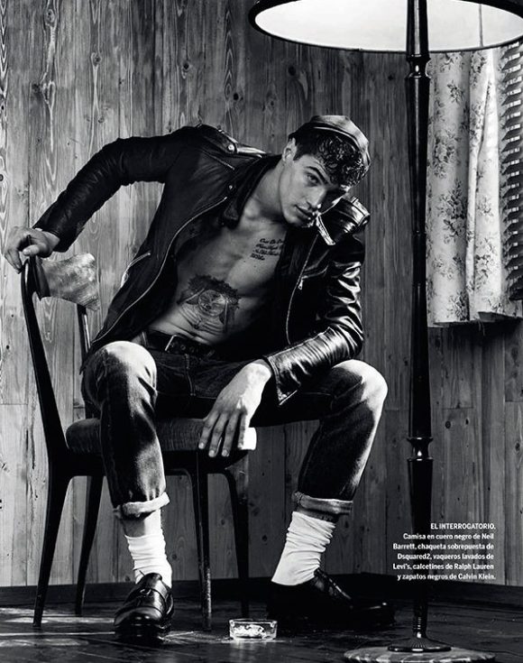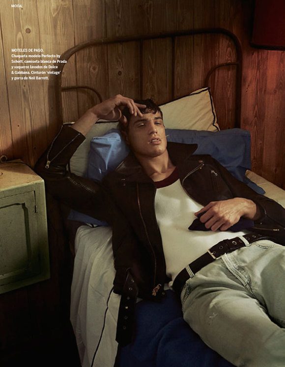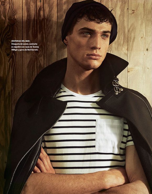 “Rebel Revamped–Once again, photographer Giampaolo Sgura and fashion editor Miguel Arnau join creative forces to realize a stunning editorial, featured in Spanish magazine El País. Inspired by the always appealing figure of the charming rebel à la Marlon Brando, mixed with the seasonal trend of fashionable nautical stripes, Sgura captures model Andy Walters (WhyNot) in leather jackets, jeans, striped numbers, basic white tees and traditional sailor black caps, providing images pervaded by a strong cinematic allure. / Hair by Andrew Guida (CloseUp Milano). Makeup by Laura Stucchi (CloseUp Milano).” – thefashionisto.com