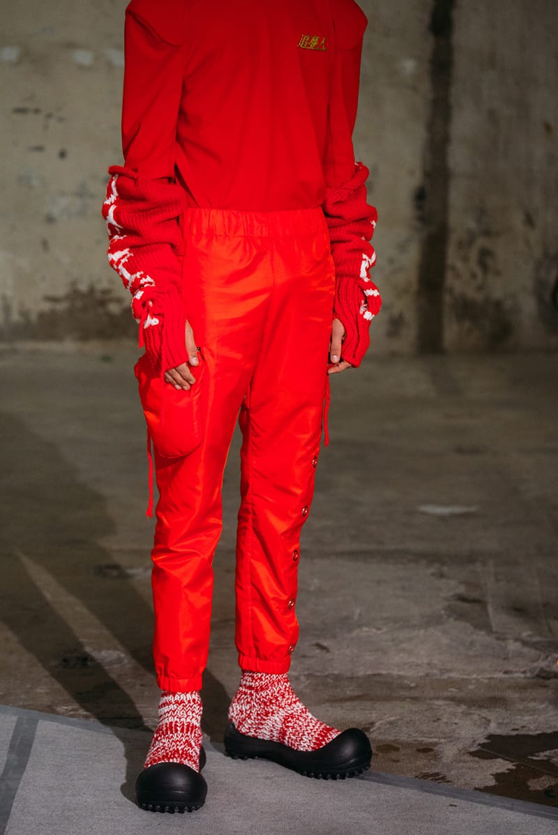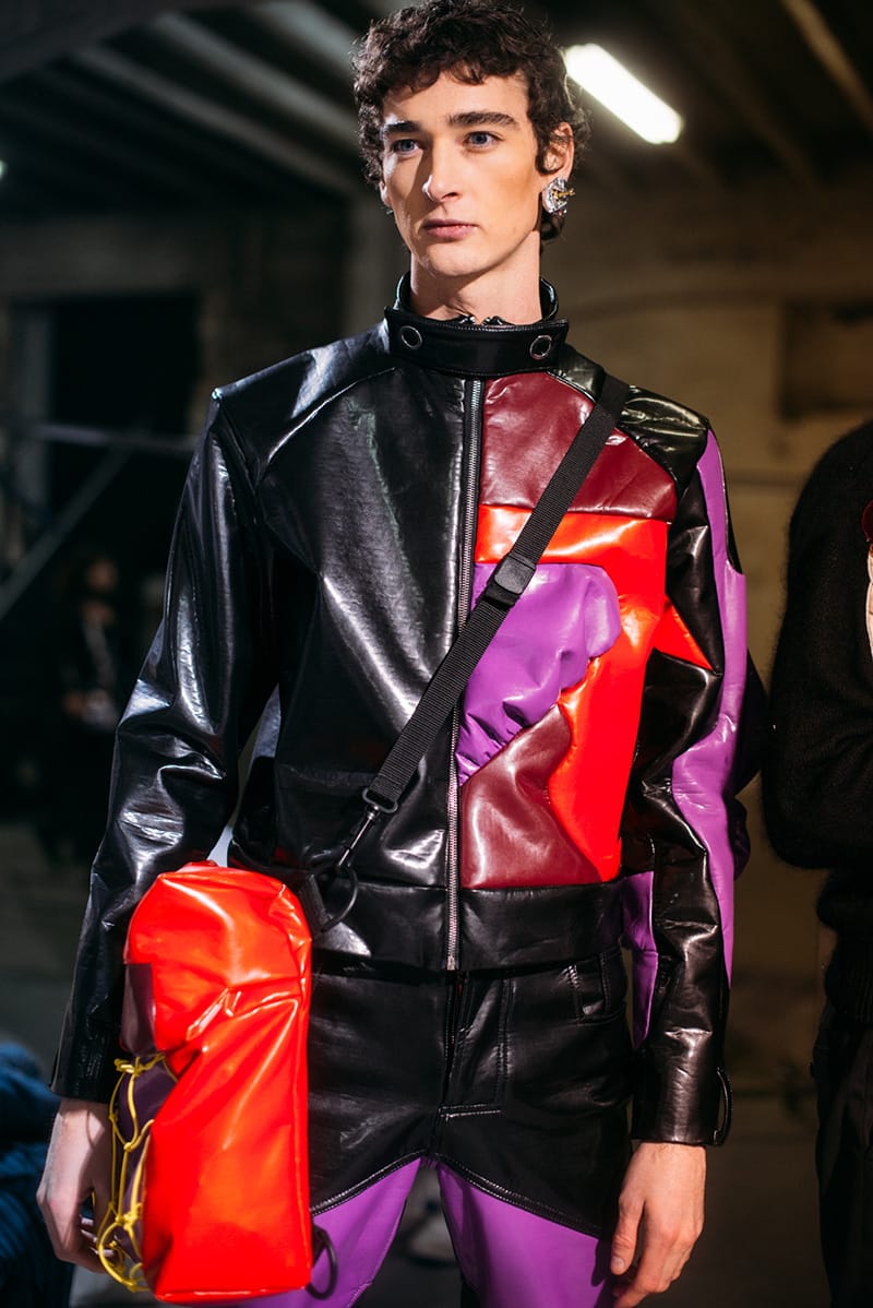 “Inspired by a rider’s gestures and the scooter’s engineered design, this collection by Angus Chiang integrates contoured lines with geometric spliced shapes: a collage of textures designed to reflect movement and speed. Slick paint job colours run through bright safety yellow and stop-sign red to violet, grass green and black to highlight graphic knitwear, heavy windbreakers, and padded biker jacket shapes, whilst frayed denim separates feature contrast yarns for a two-tone effect. Developed in collaboration with Mackent Fabrics, an ecological mesh textile creates a sculptural fit, whilst lurex elements echo the scooter’s metallic sheen. Coinciding with the 35th anniversary of the Nike Air Force One, ANGUS CHIANG has customised the iconic high-top with inflatable insole details, fusing it with the brand’s signature MIKI boot. A new hand knitted cross-weaving technique elevates the MIKI’s knitted structure with a unique 3D surface structure.