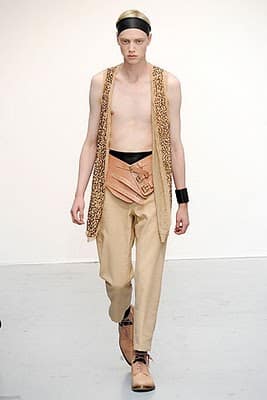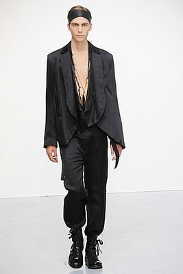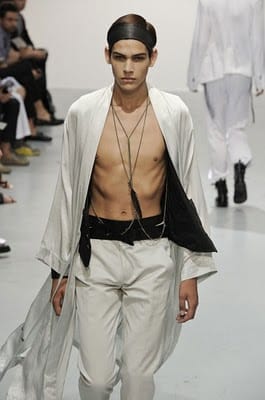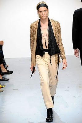 In her signature palette of black, cream and white Demeulemeester used leather set against floaty delicate fabrics to produce a collection that conveys a delicate intelligience. Headbands were the prescribed accessory and hoods provided protection for bare-chested boys. Skinny waistcoats over draped pants, large cumberbands and sequins are all key elements of the designer’s fashion language and again she used them to maximum effect. Demeulemeester’s rich and beautifully crafted clothes have a solid following by those who appreciate the character and soul the designer embodies in each collection.