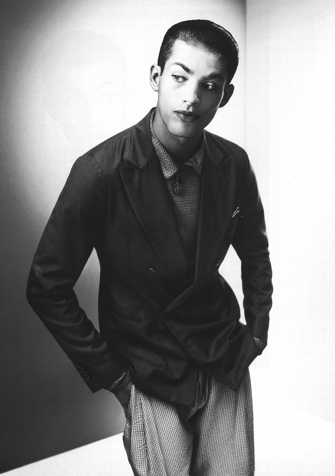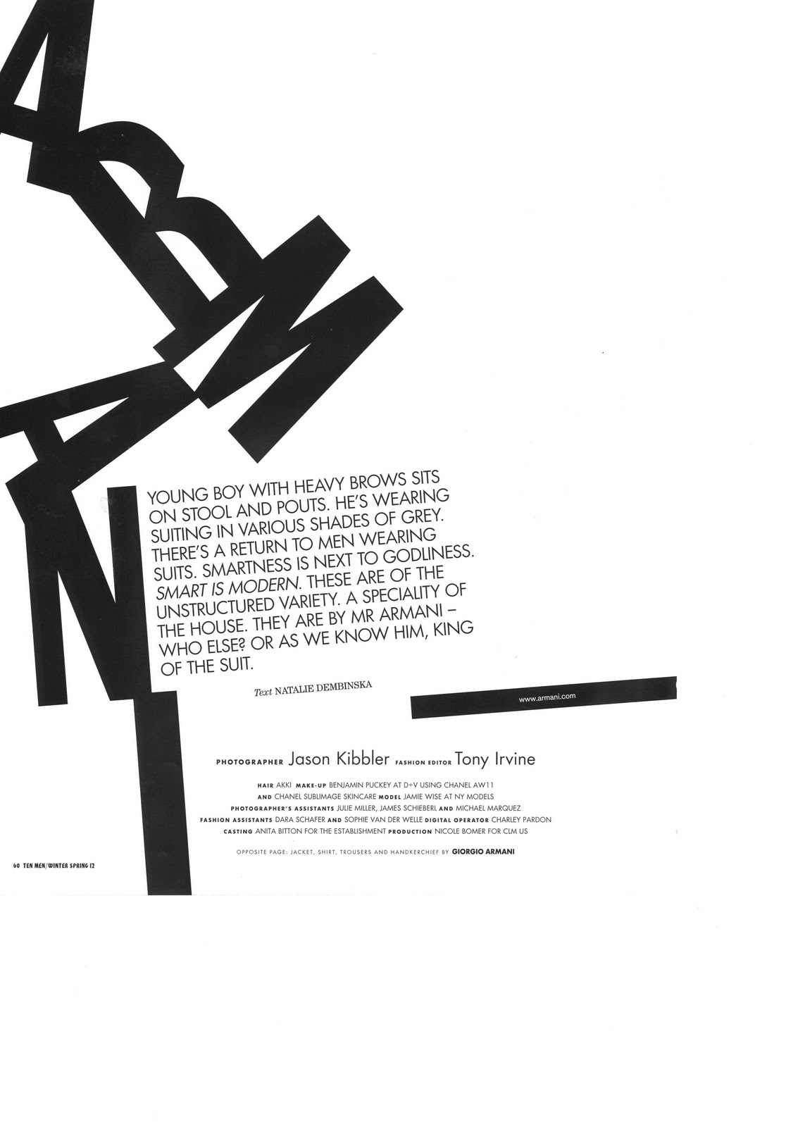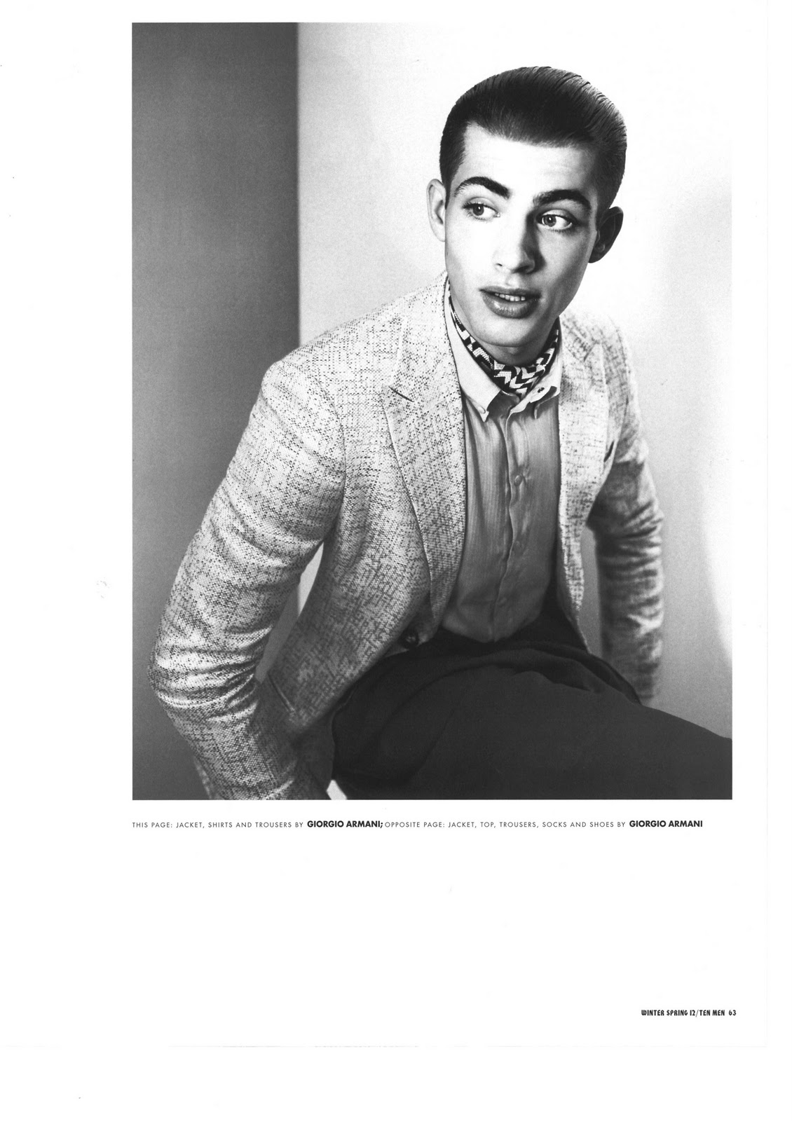 Jamie Wise is decked out in all Giorgio Armani for this shoot dedicated to the Italian sartorial master. Jason Kibber captures the stunning British lad in quirky poses to accentuate the fluidity and movement Armani’s clothing has and the effect wearing all-Armani can do for one’s aesthetic. The shoot is styled by Tony Irvine. Courtesy of – hommemodel.blogspot.com