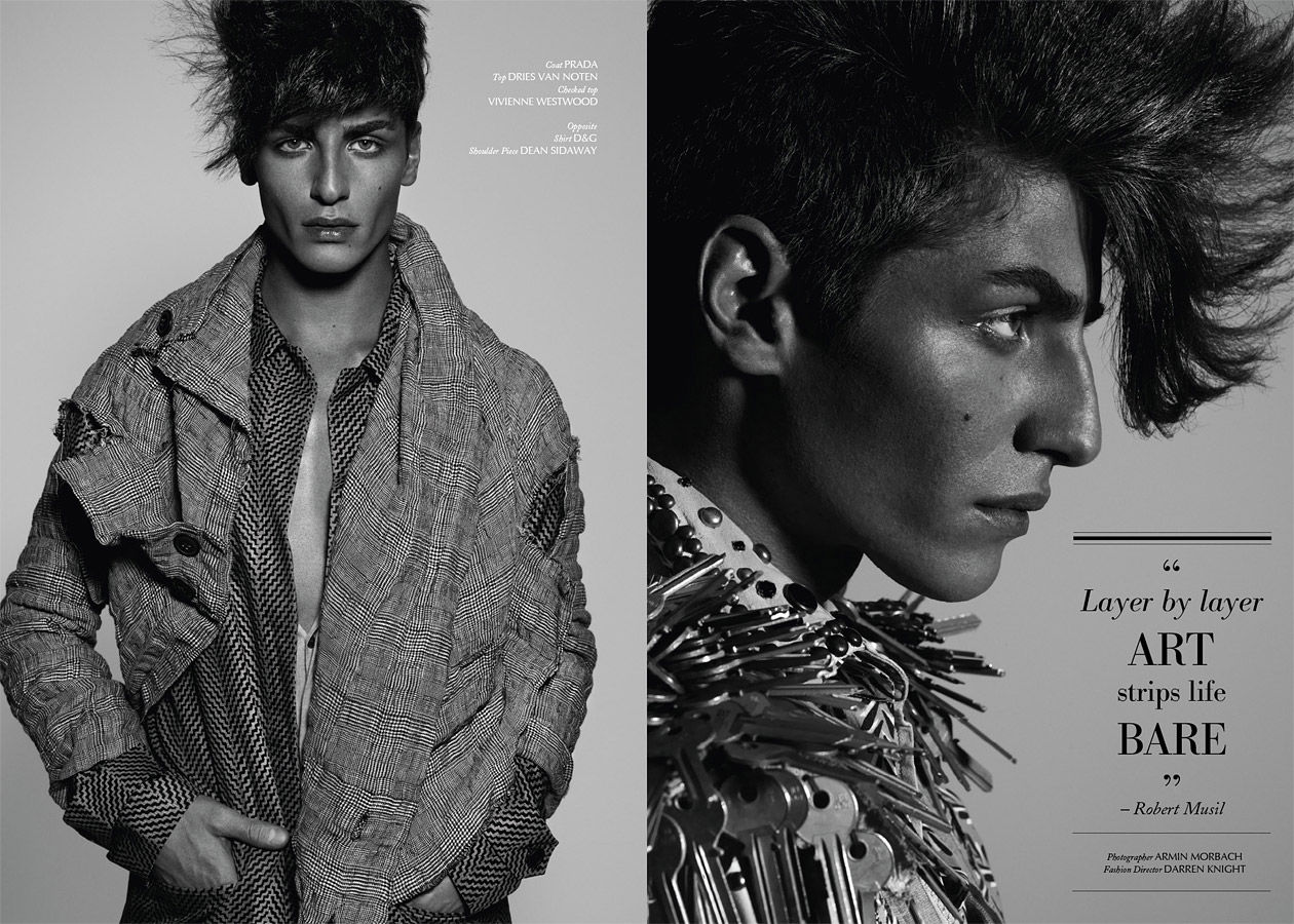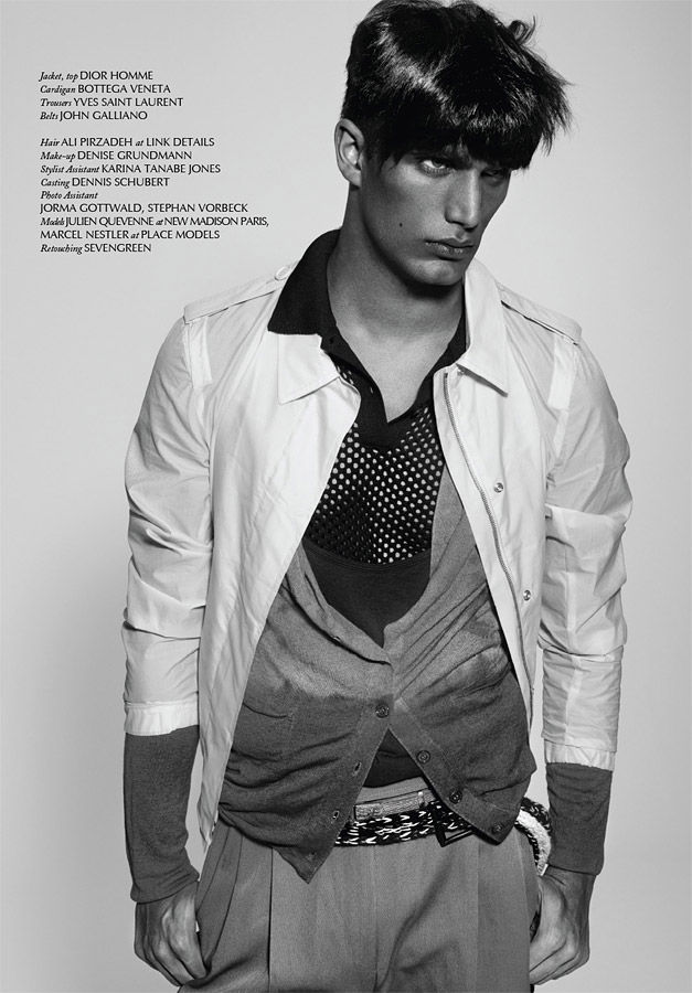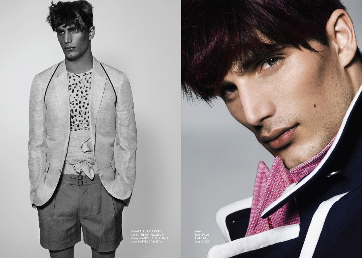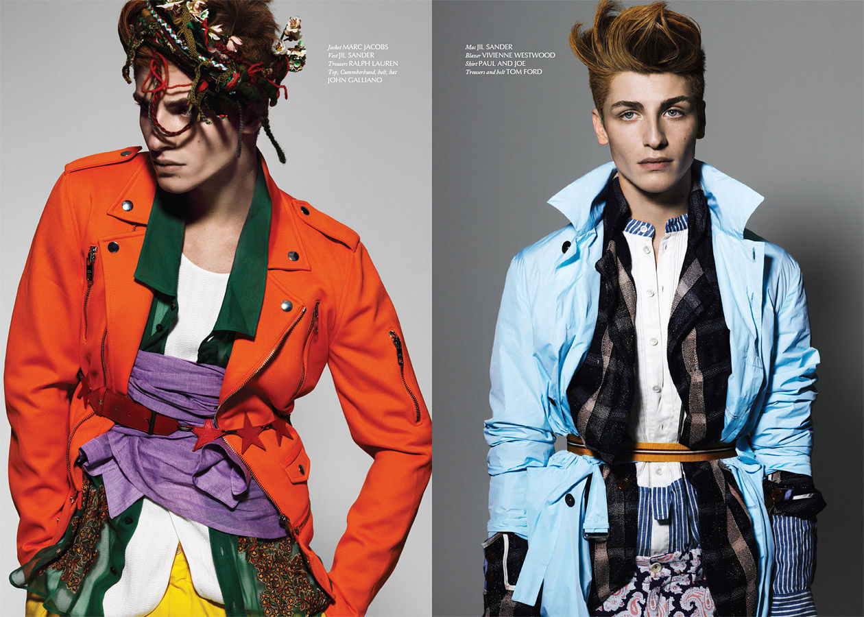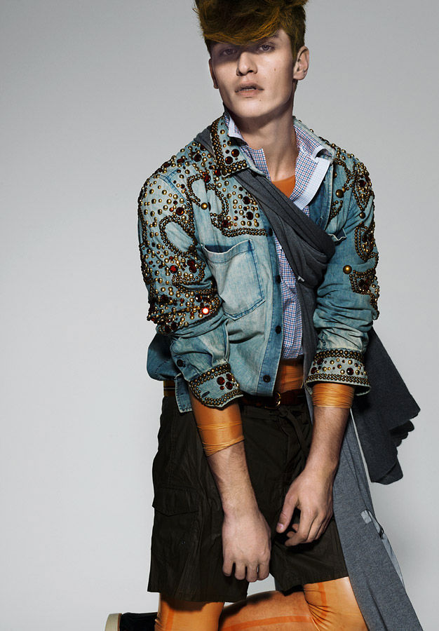 Julien Quevenne appears in Sheer’s debut issue in this eccentric shoot from Armin Morbach and styled Darren Knight. A mix of patterns and colors dominates the shoot such as a a tangerine Marc Jacobs trench worn over layers upon layers of clothing from Jil Sander, John Galliano and Ralph Lauren. Courtesy of – hommemodel.blogspot.com