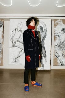 The designer continues to explore the theme of young adulthood in his work. Together with an artist Tamara Key, Shumov creates a space, where he exposes the outside and inside the world of the brand’s client. The collection is based on classical suites and coats in combination with kids-style details such as pants with knee patches and white shirts with hand-colored collars.