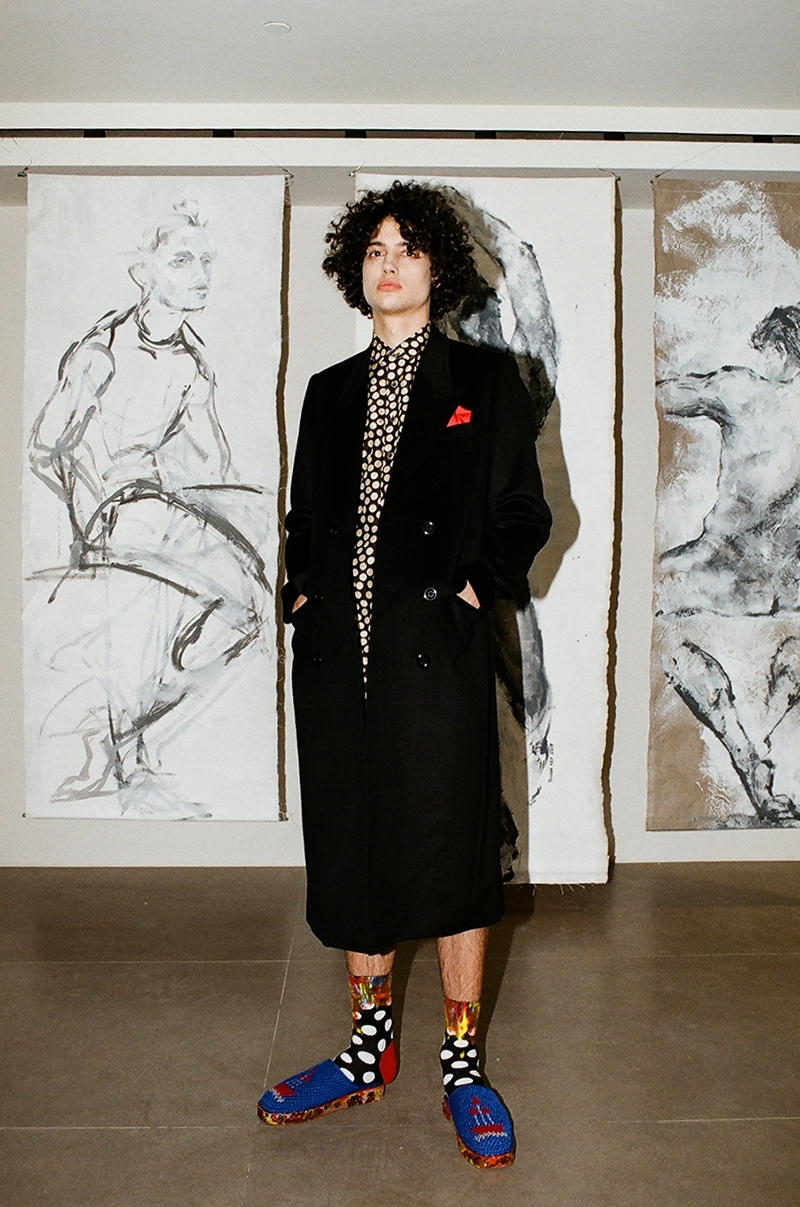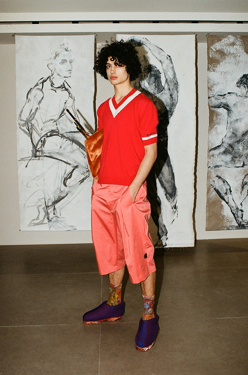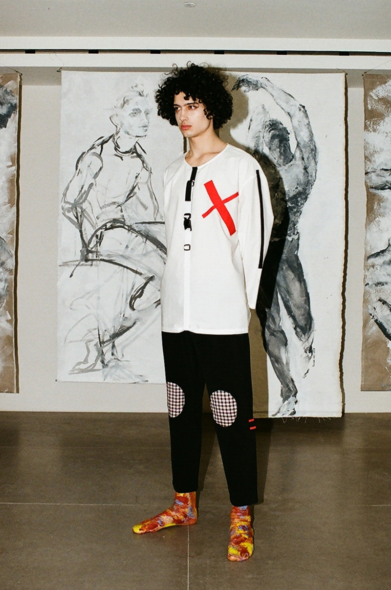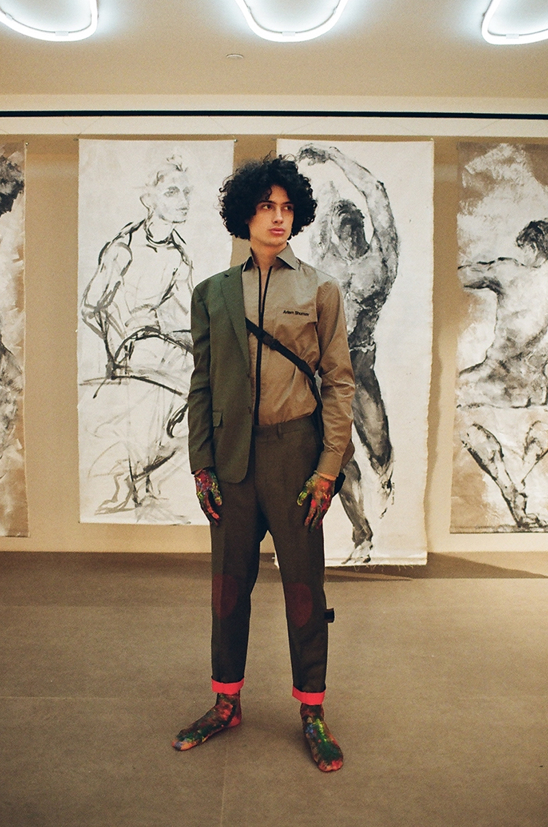 Artem shares his inspiration behind the collection: “Last season I worked a lot with paint, so I let myself to play with it a little. Specifically for the lookbook my friend Tamara Key created a series of canvases, which reflect the mood of this collection and the model had his hands, shirt and socks stained with paint”.
