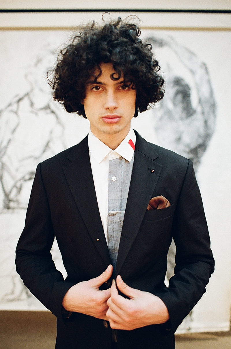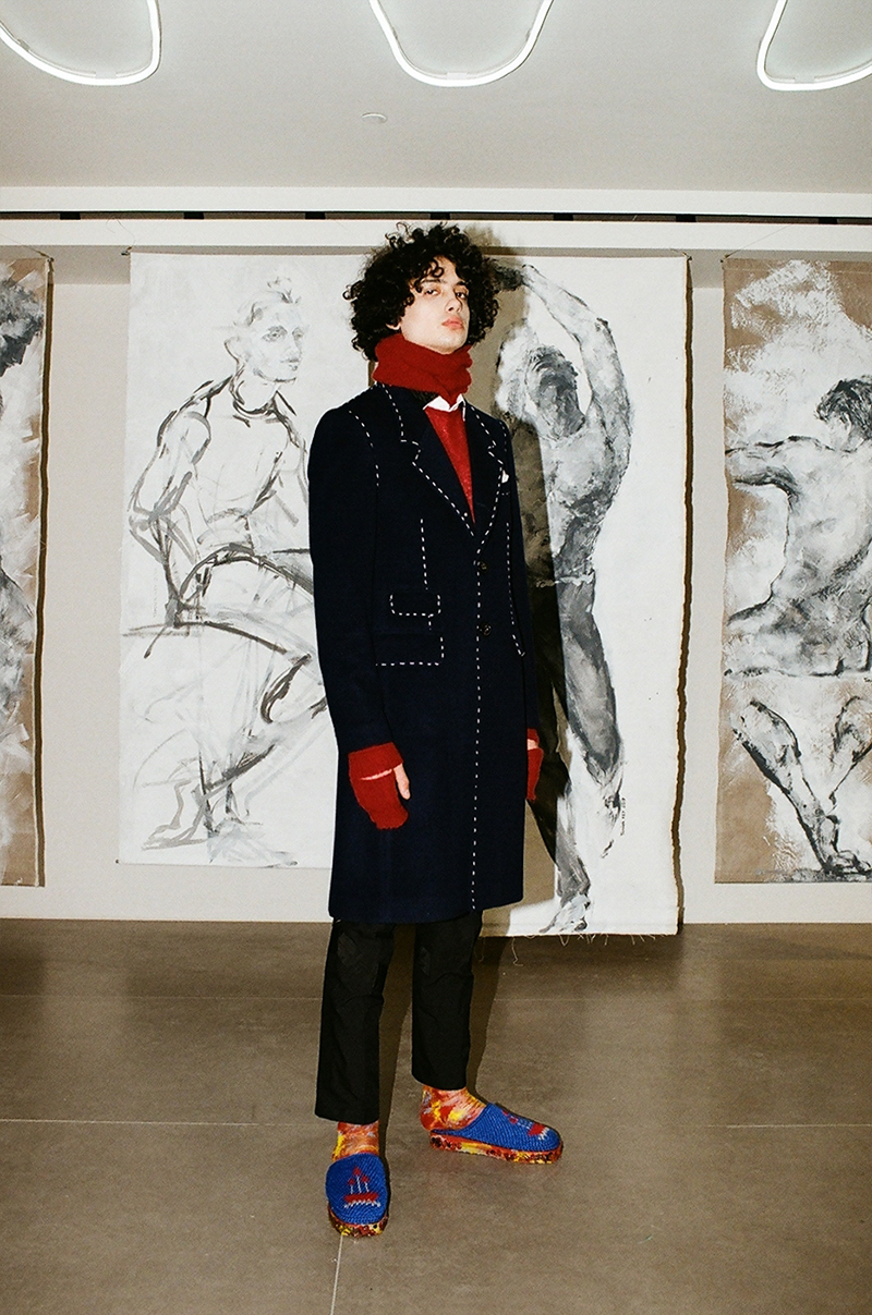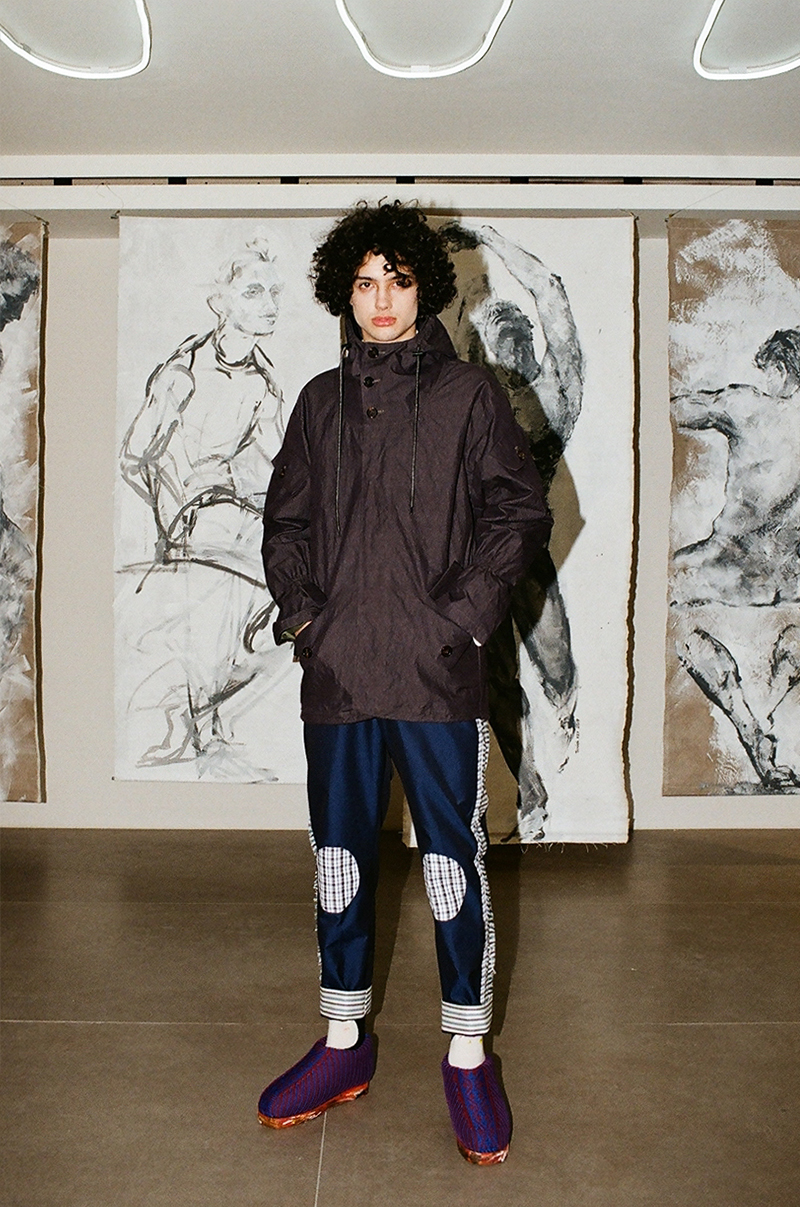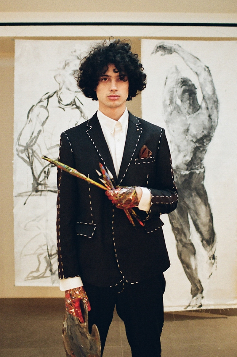 The designer continues to explore the theme of young adulthood in his work. Together with an artist Tamara Key, Shumov creates a space, where he exposes the outside and inside the world of the brand’s client. The collection is based on classical suites and coats in combination with kids-style details such as pants with knee patches and white shirts with hand-colored collars.