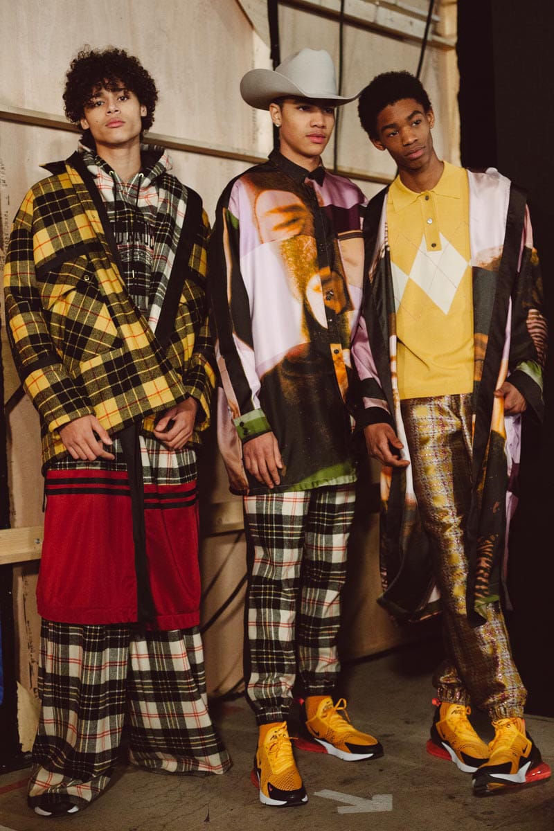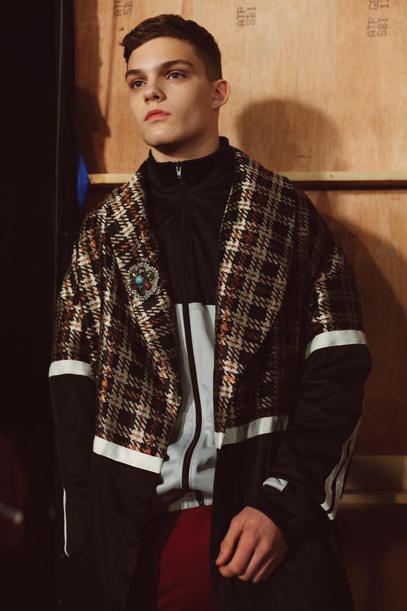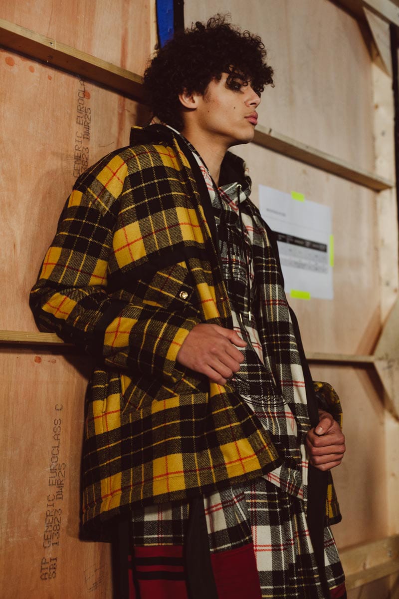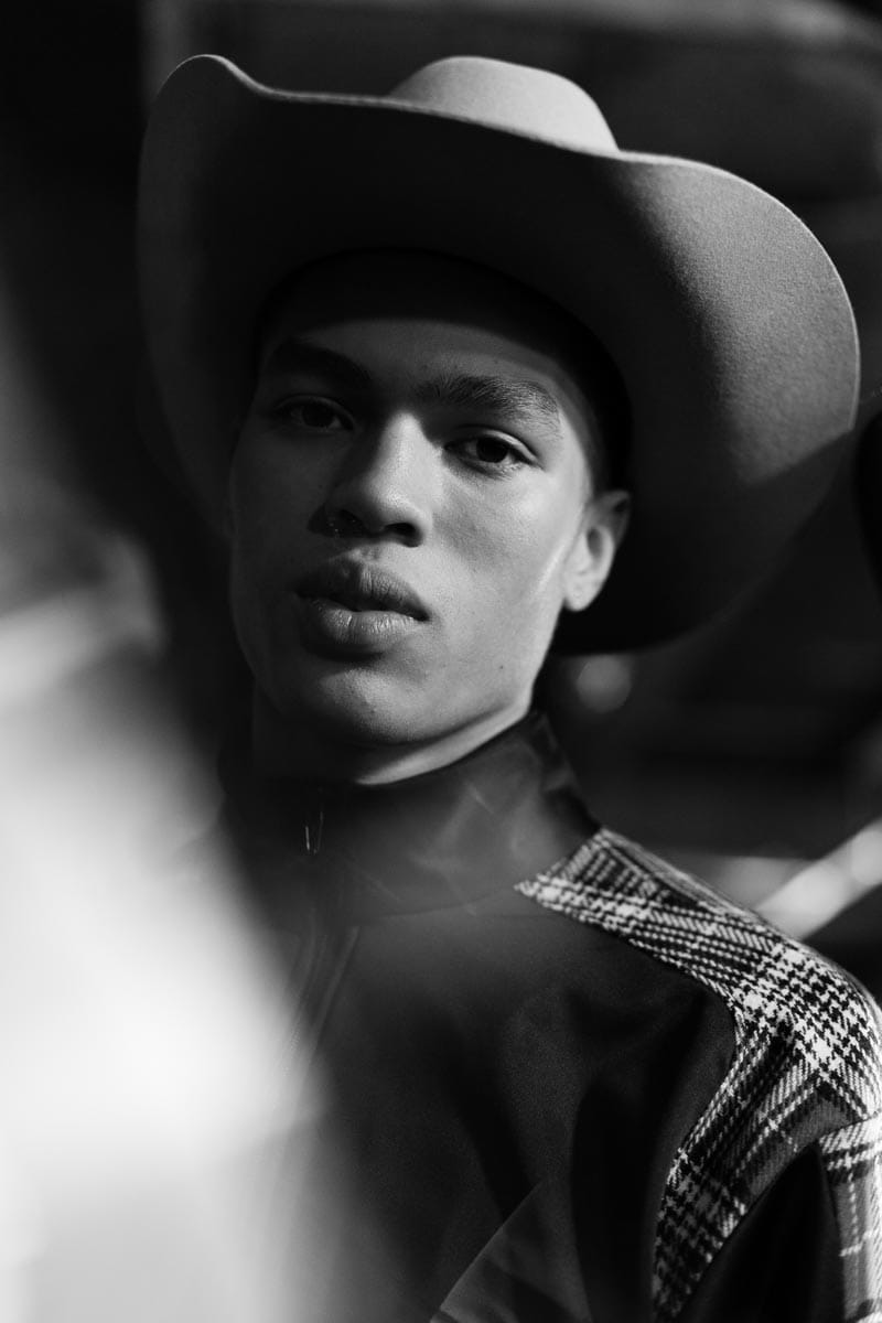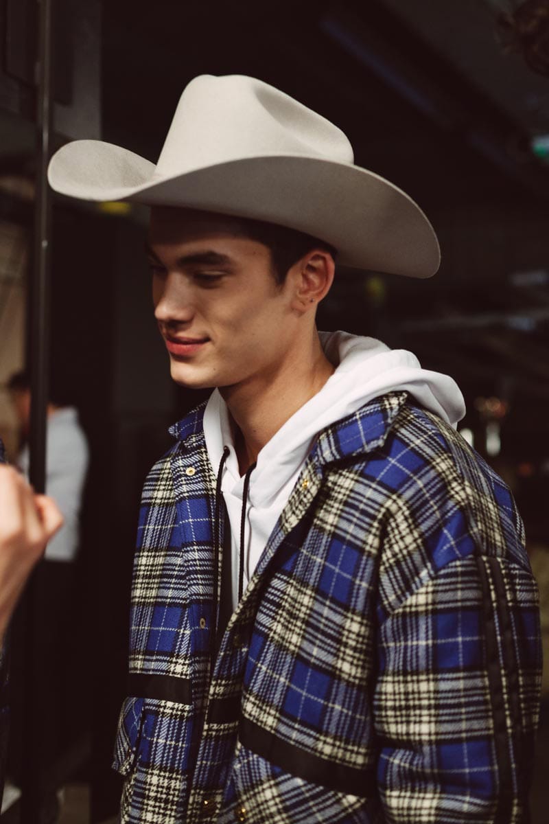 The cowboy/ Western theme can be seen in each look through the use of head accessories, pointed Western boots and checked side-stripes on tracksuit trousers and all-over printed shirts. Layers are also key, as jackets are thrown over hoodies, and short-sleeved long-line tees thrown over long-sleeve shirts.