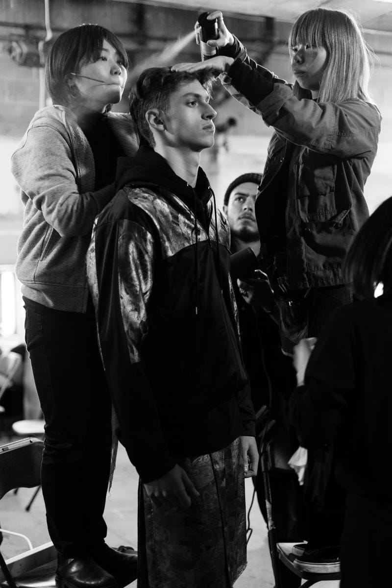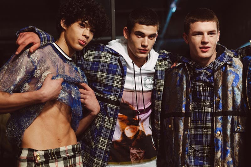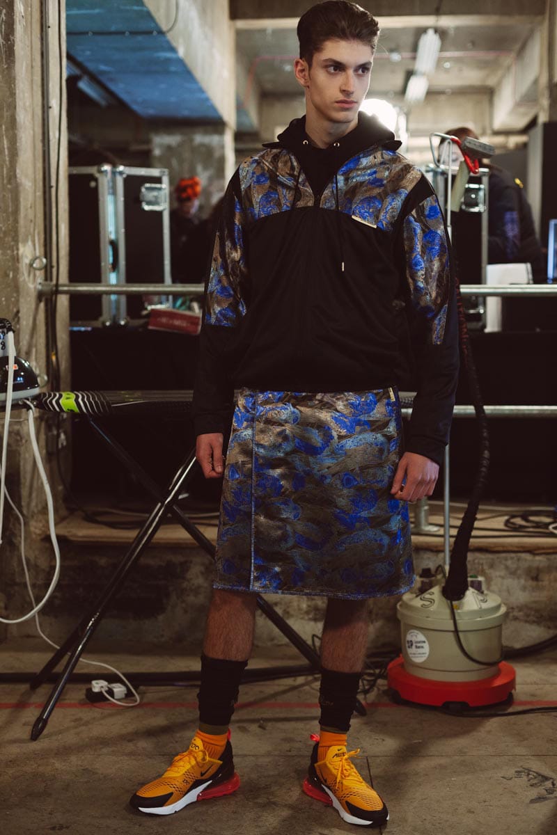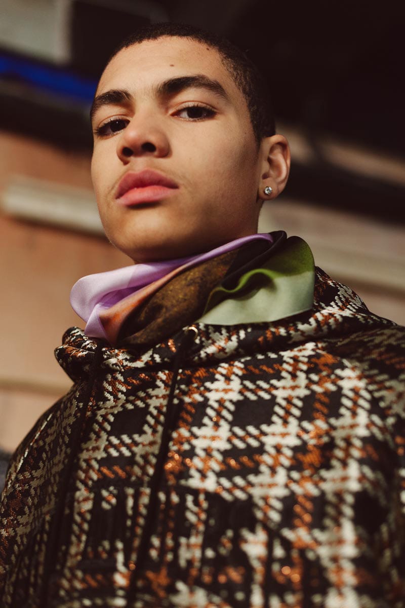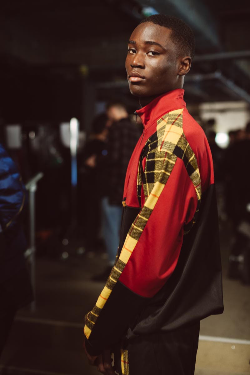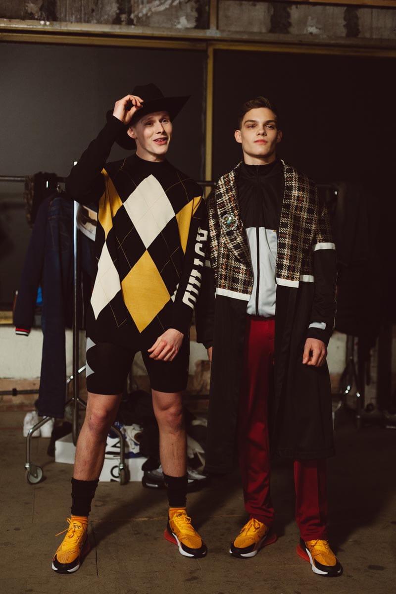 The cowboy/ Western theme can be seen in each look through the use of head accessories, pointed Western boots and checked side-stripes on tracksuit trousers and all-over printed shirts. Layers are also key, as jackets are thrown over hoodies, and short-sleeved long-line tees thrown over long-sleeve shirts.
