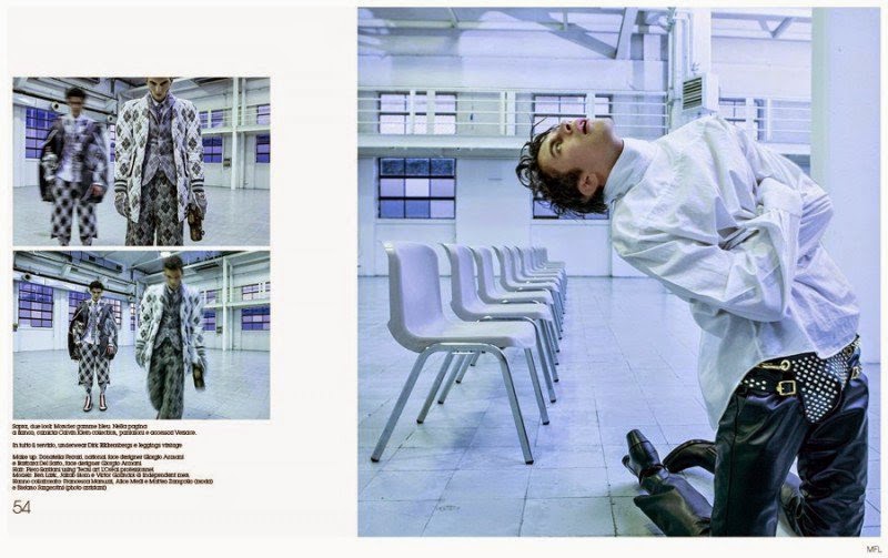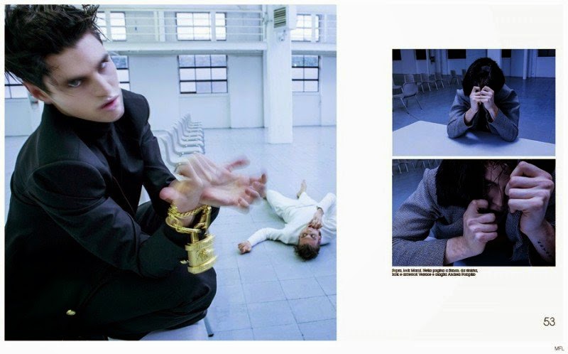 Asylum-Photographed by Michele De Andreis for the latest edition of MFL magazine, models Ben Lark, Jakob Blom and Victor Gorincioi have a moment of insanity in the name of fashion. Styled by Stefano Roncato, the boys model fall pieces from Dsquared2, Prada, Calvin Klein Collection and more. / Makeup by Donatella Ferrari. Hair by Piero Bastiani using Tecni art L’Oreal Professional. Courtesy of – thefashionisto.com
