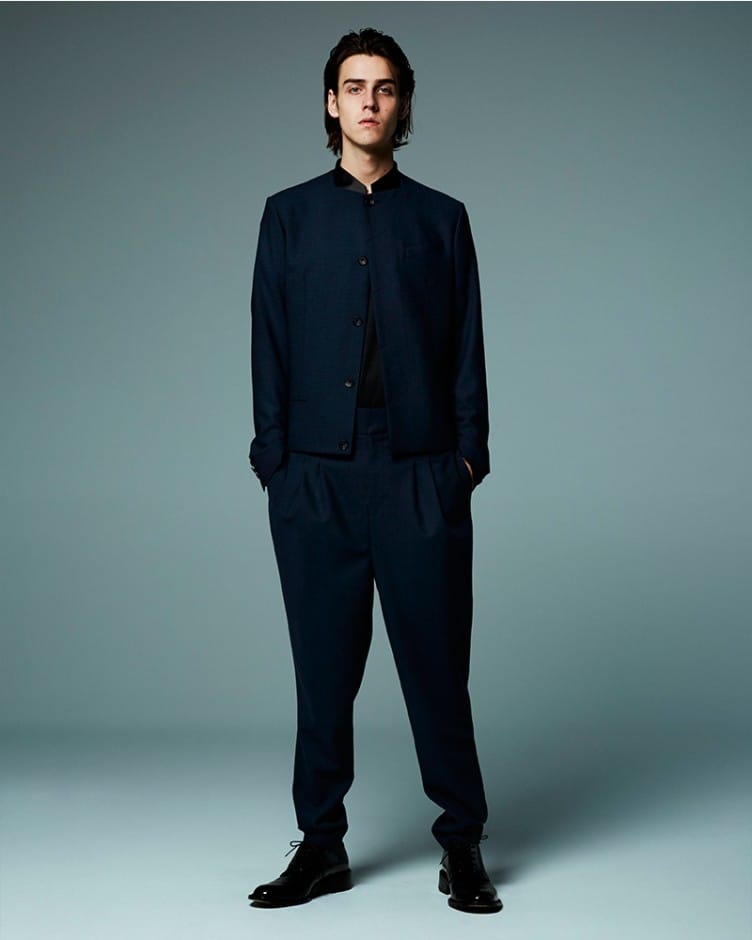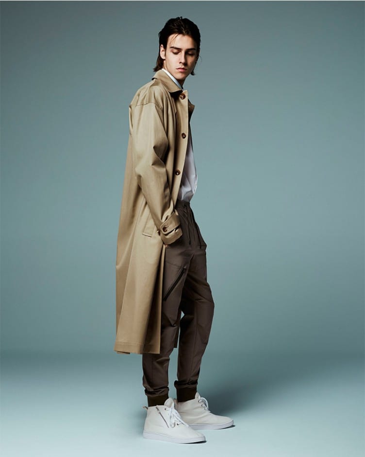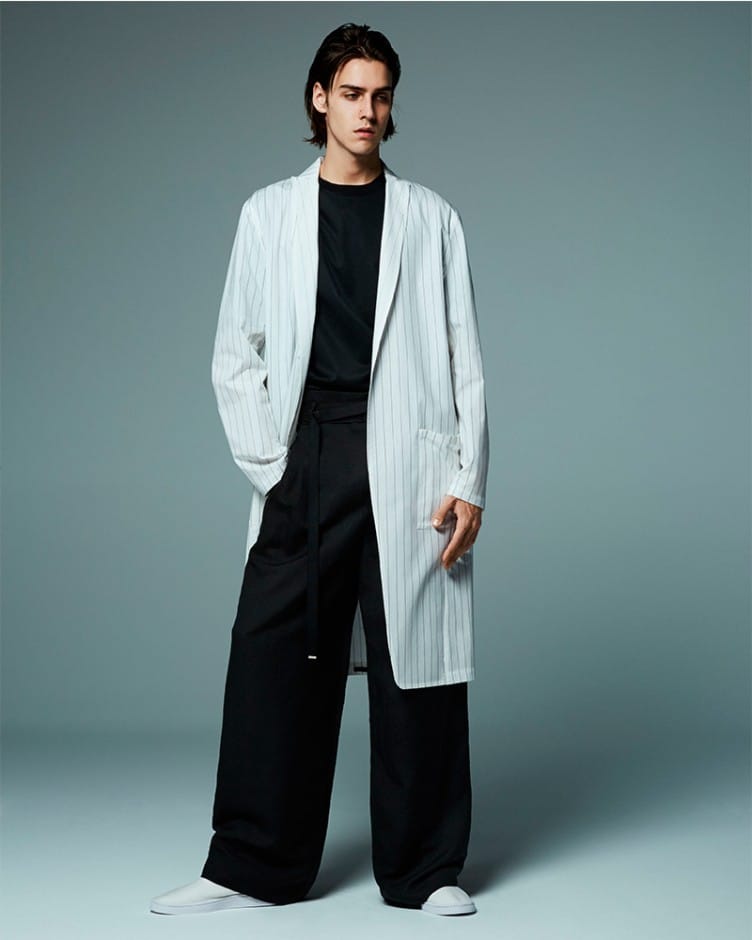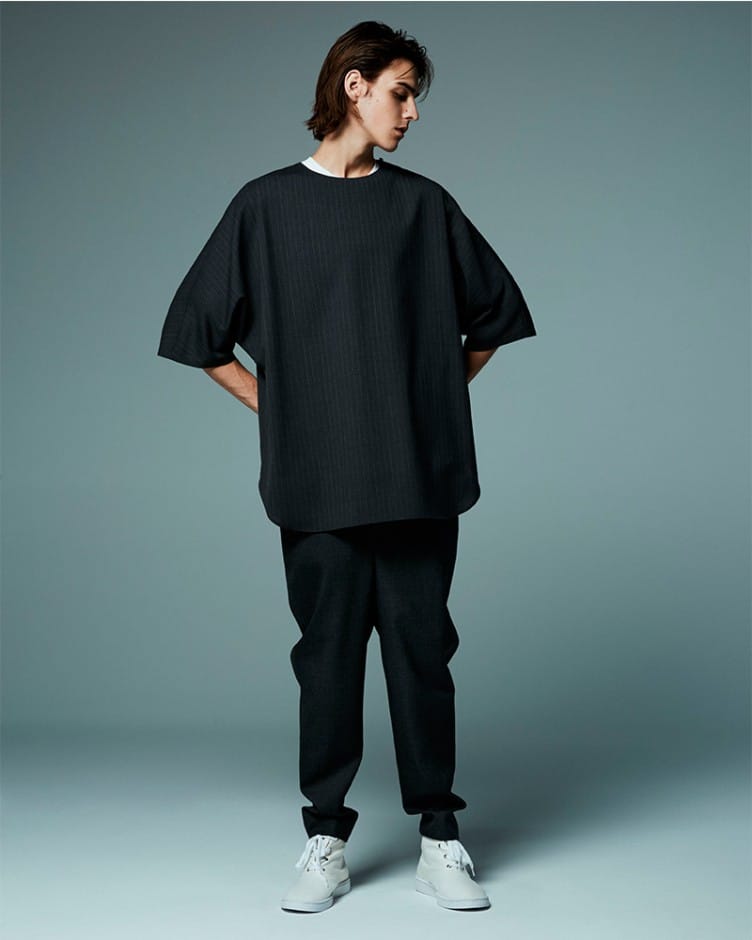 Menswear essentials – such as cotton jackets and coats, wide linen trousers, nylon blousons, wool sweaters, and MA-1 jackets – are updated with sharp tailoring accentuated with functional details. The silhouettes are oversized and play with the space between the body line and the garments, highlighting the wearerʼs character as well as the brandʼs characteristics. The color palette includes black, light grey, beige in modestly masculine and luxurious textures.