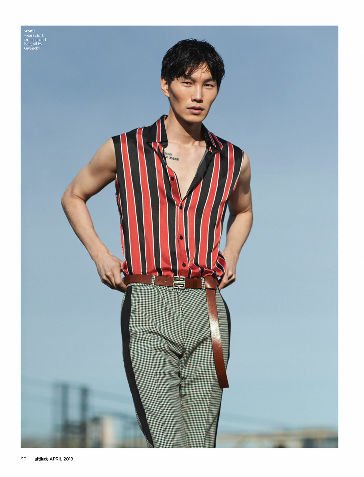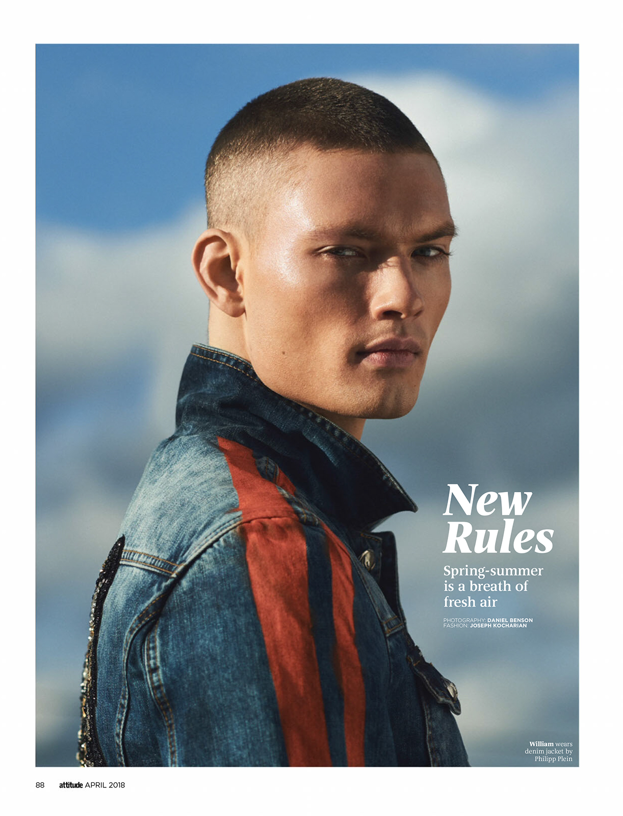 “New rules” is the title of this editorial by Joseph Kocharian featuring William Los and Jo Wonil groomed by James Oxley and photographed by Daniel Benson for this month’s issue of British magazine Attitude.” – https://morphoman.blogspot.com/2018/04/attitude-0418.html