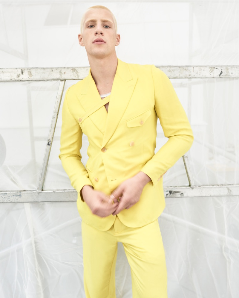 “Augusta Alexander debuts a new look as he goes platinum blond for How to Spend It. The Austrian model couples up with Aweng Chuol for the fashion shoot. Captured by Mariano Vivanco (Lighthouse Photo Agency), Augusta wears looks styled by Damian Foxe. Sporting a color palette of white and yellow as well, Aweng is dressed by Elad Bitton. Front and center, Augusta inspires in ethreal fashions from brands like Louis Vuitton.” – TheFashionisto.com