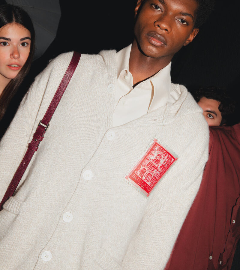 Male model in a cream cardigan with a red stamp-like patch, white shirt underneath, maroon shoulder strap visible; dark background with a female model partially seen on the left. Male model in a cream cardigan with a red stamp-like patch, white shirt underneath, maroon shoulder strap visible; dark background with a female model partially seen on the left.