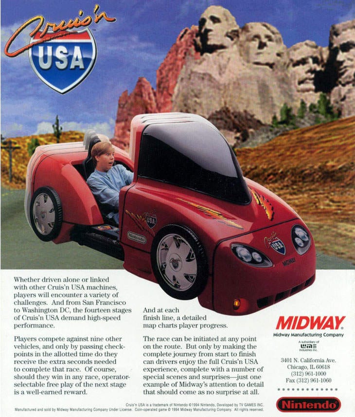 Also like Out Run, one of Cruis’n USA’s arcade machines was shaped like a car: