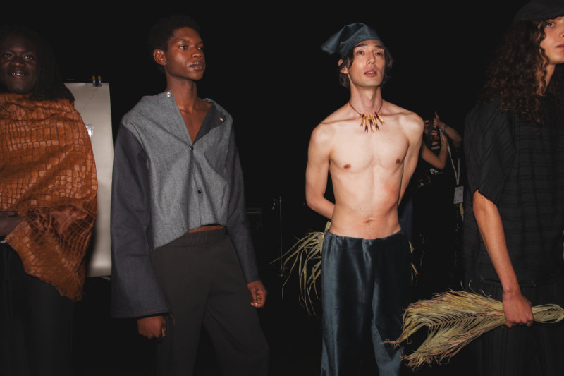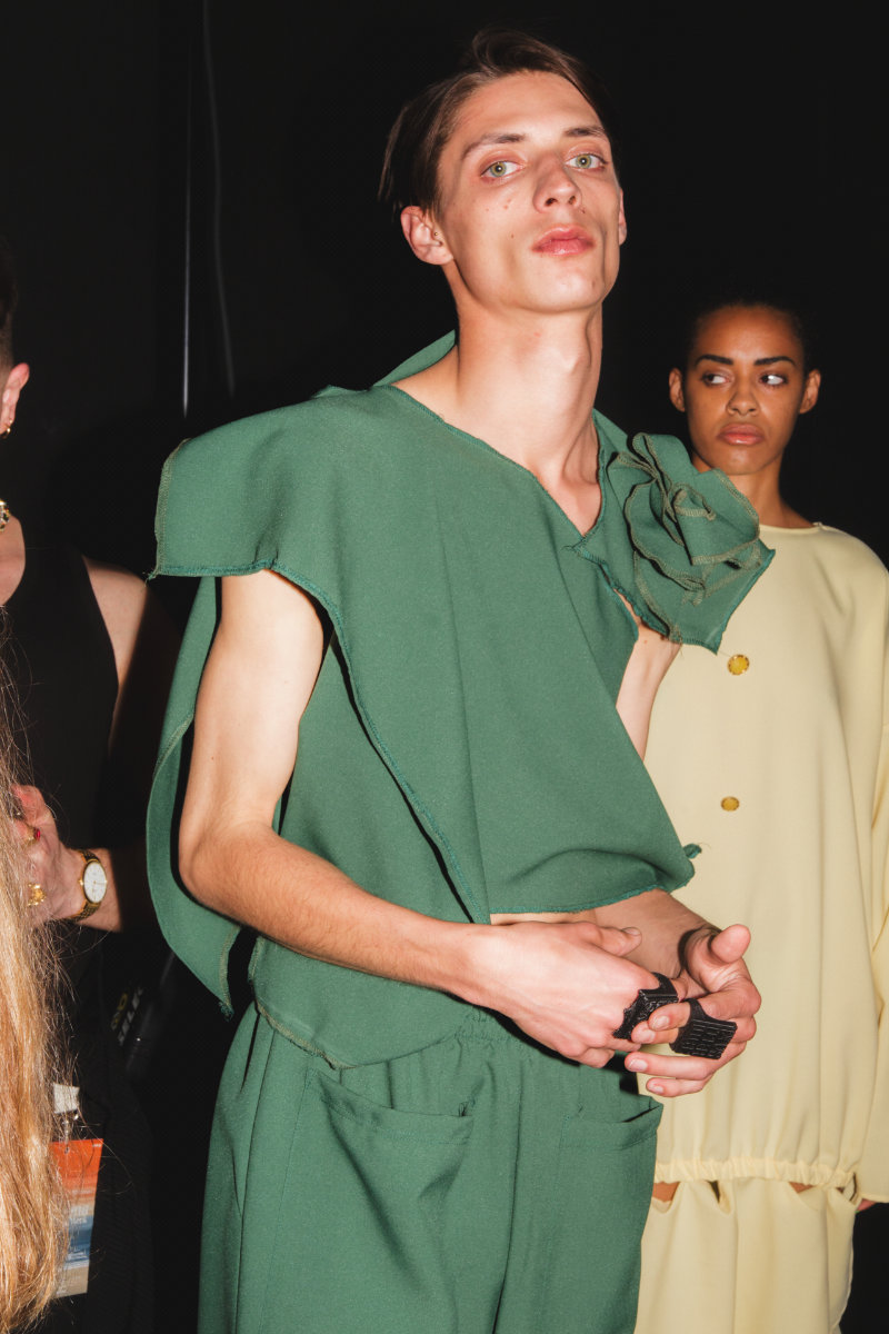 An exclusive FY Magazine! backstage look at XV STRANGE’s “Meaning of WOSONGLE” collection, captured at 080 Barcelona Fashion by Ángela Ibañez.