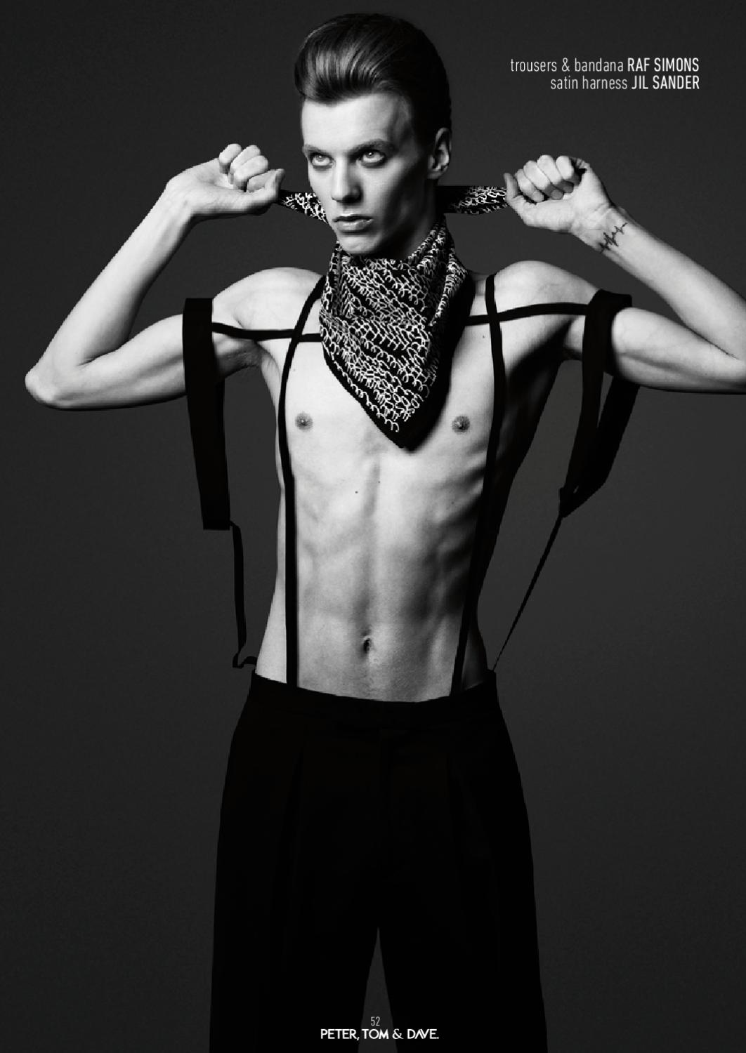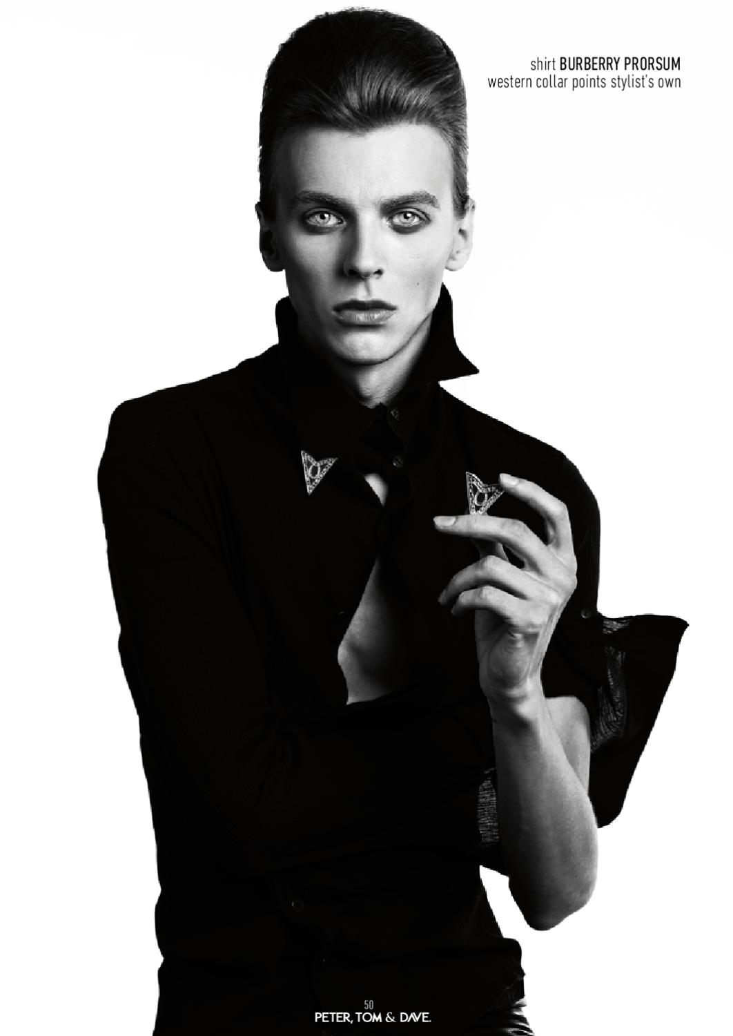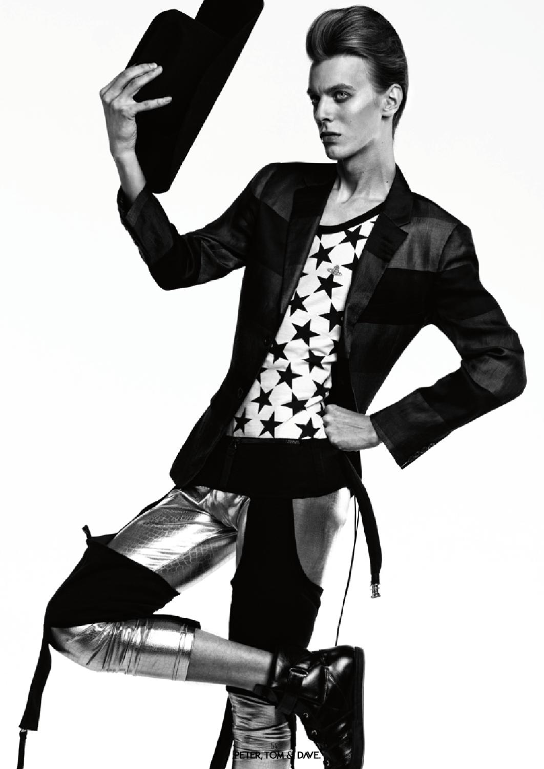 DNA’s latest find, Alexey Galetskiy, appears on the cover of Peter, Tom & Dave’s eighth issue shot by New York based photographer Richard Pier Petit. Eugene Ong transforms the Russian model into the Legendary Stardust Cowboy, a Rock n’ Roll performer from the 1960s whose style and look are akin to that of David Bowie. Courtesy of – hommemodel.blogspot.com