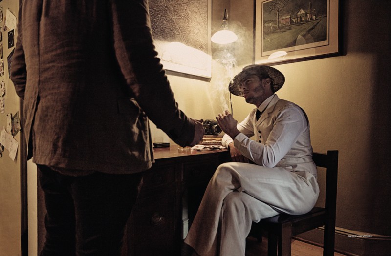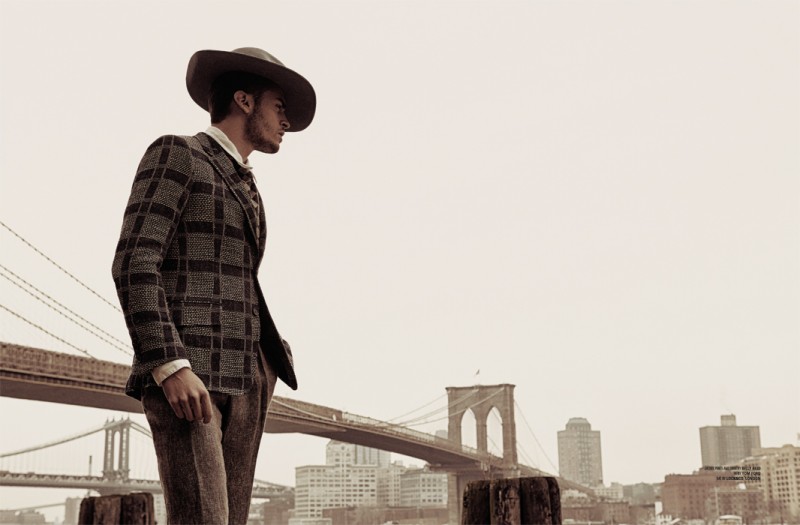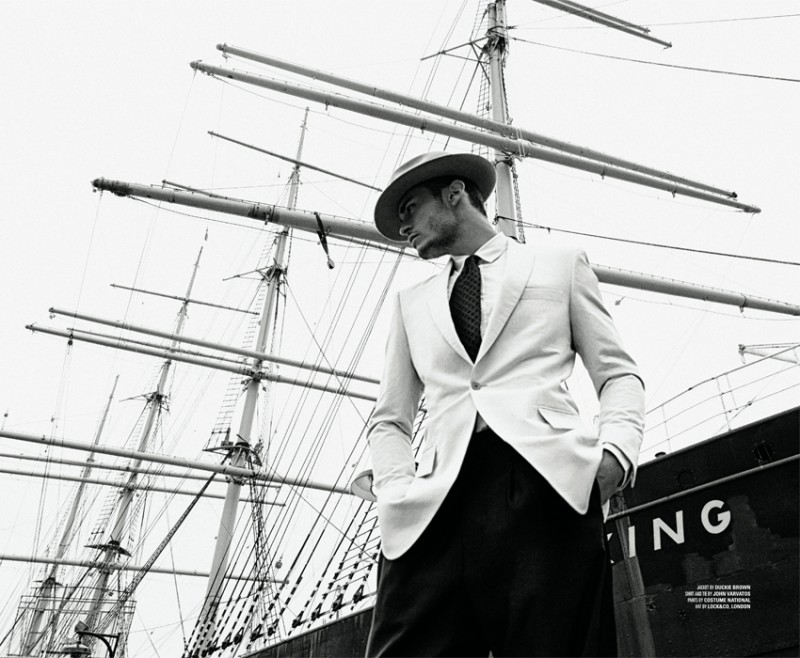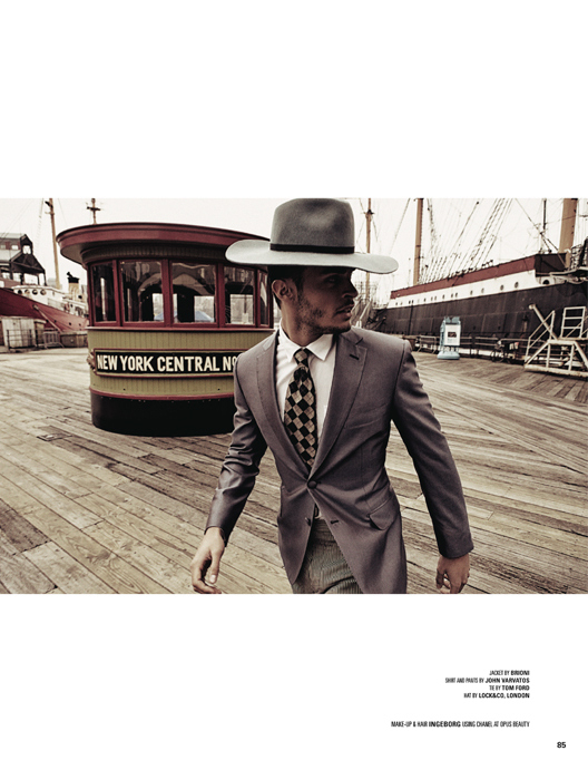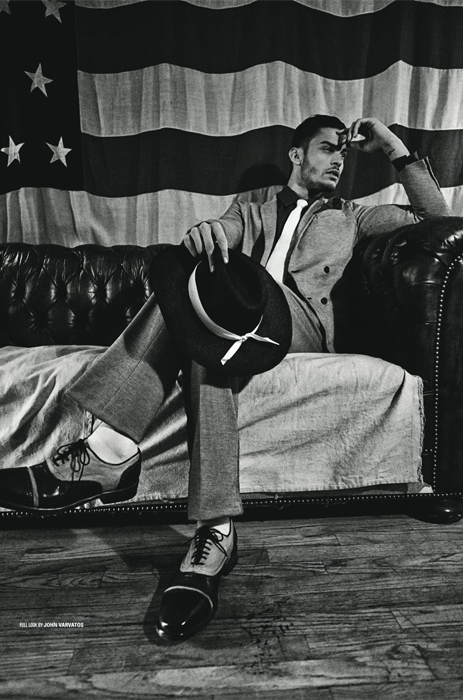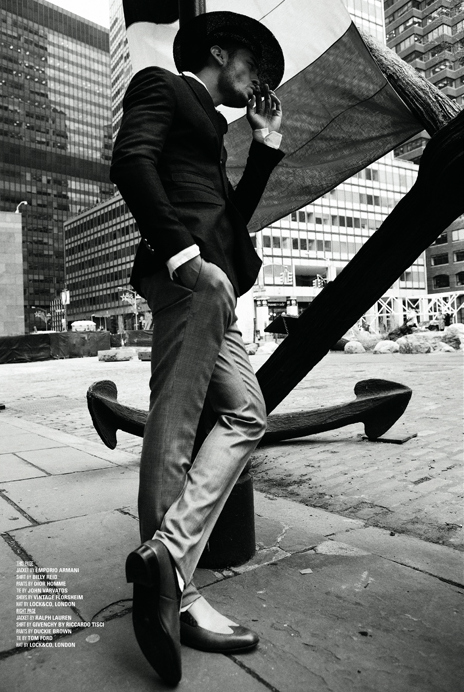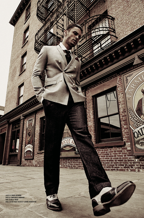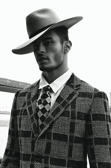 Hat Required–Decked out in a wardrobe inspired by the style of the gangsters from the 1920′s, DNA model Baptiste Giabiconi reunites with photographer Jack Waterlot for a story published in DSection’s latest issue. Styled by Andrew Holden in formal looks, including sartorial suits and textured jackets, the French model hits the streets of a modern city, wearing the designs of Dior Homme, Brioni, Emporio Armani and others. Silk ties and two-toned leather shoes complete Baptiste’s looks, but this season real key-item is definitely the large fedora hat, that adds a polished retro flavor to formal styles. / Grooming by Ingeborg. Courtesy of – thefashionisto.com