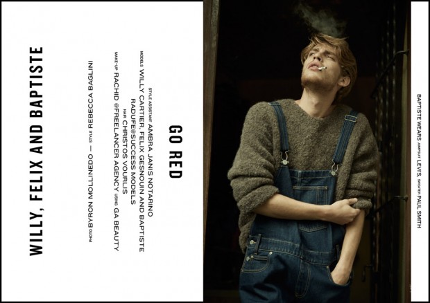 “Fashion photographer Byron Mollinedo captures the cover story of RedMilk Magazine‘s Man Issue featuring top models Baptiste Radufe, Felix Gesnouin, and Willy Cartier. Styling is work of Rebecca Baglini with hair by Christos Vourlis, and makeup by Rachid at Freelancer Agency using Ga Beauty. For the session models (all represented by Success Models) are wearing looks from Adidas Originals, Asos, Burberry Prorsum, Calvin Klein Collection, Carhartt, Ermenegildo Zegna, Kenzo, Levi’s, Levi’s Made&Crafted, Marcelo Burlon County of Milan, Marc Jacobs, Missoni, MM6 Maison Martin Margiela, Paul Smith, Pringle of Scotland, Var/City, and Vetements.” – Malemodelscene.net