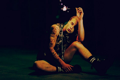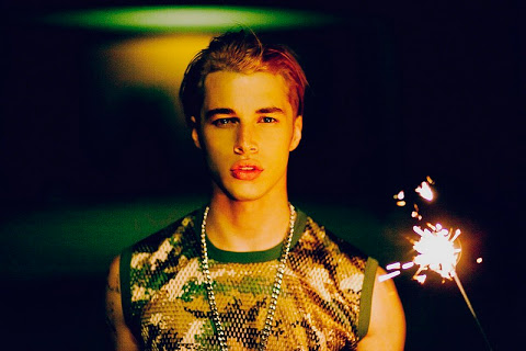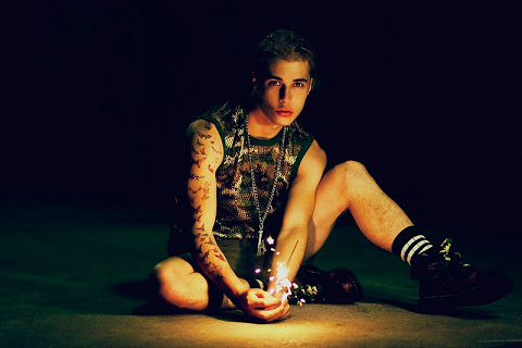 Model Benjamin Charles is photographed by Mikey Whyte and styled by Johnny Le in an Aligator neckpiece by Vlad Kanevsky (above), stylist’s own Camo Singlet, Shorts and LA Necklace, Dr.Marten Boots with camo laces (below). Courtesy of – Homotography