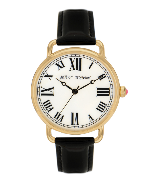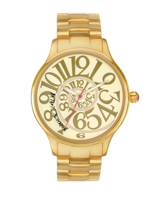 After being ushered into a room filled with a couple of Betsey‘s handlers, I was welcomed to take a seat next to the famed designer, while another employee spread Betsey’s just-launched watch collection on the table. I introduced myself to Johnson, who gave me a warm welcome and motioned a hello with one hand–the other hand was otherwise occupied, getting a manicure. “I need my quick dry…where’s the quick dry?” she rasped, turning to her manicurist. “I have to fix the tips on my nails, if anyone takes pictures…” she trailed off, giving me a knowing look.Once Betsey settled in a bit, we got down to business: The watches. “I hate to say it,” said Johnson, picking up a classic-looking round watch with leather strap, “But after the digital space cadet one, this one is my favorite because I’m grandma classic.”